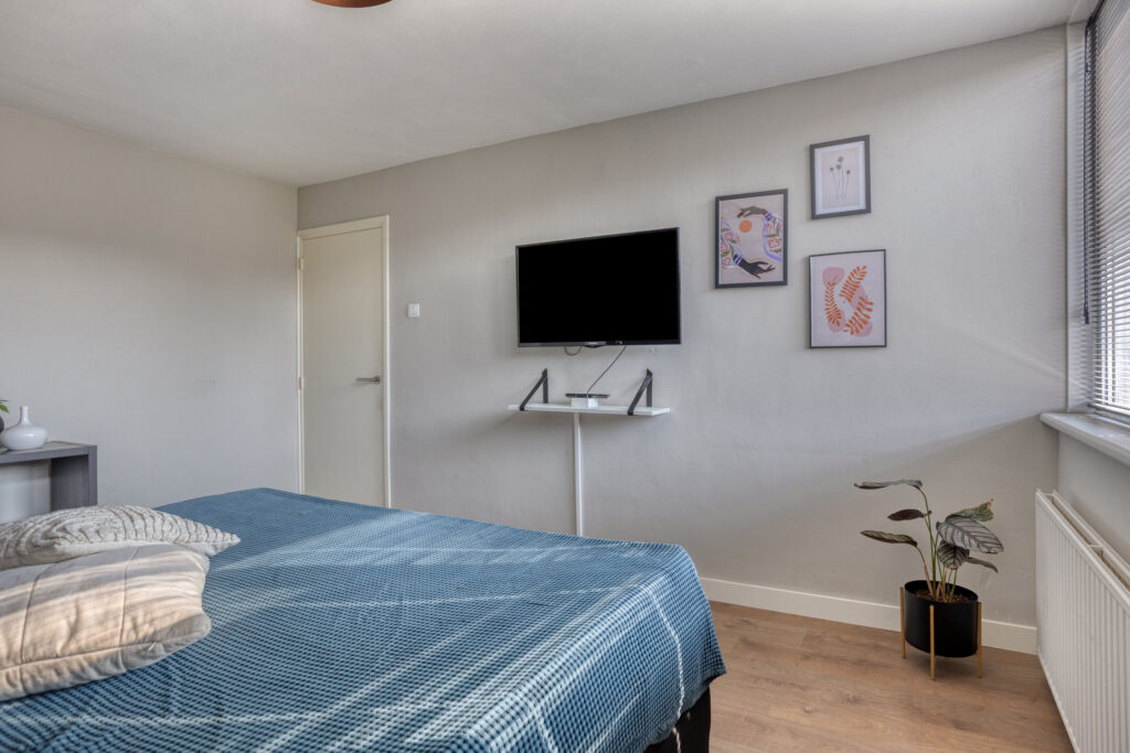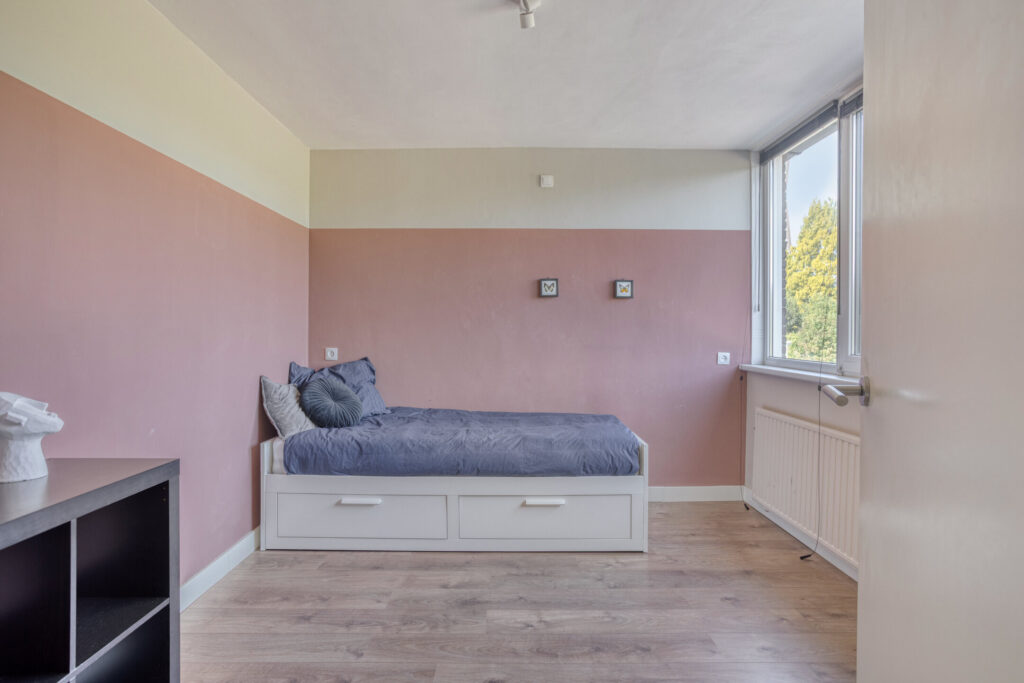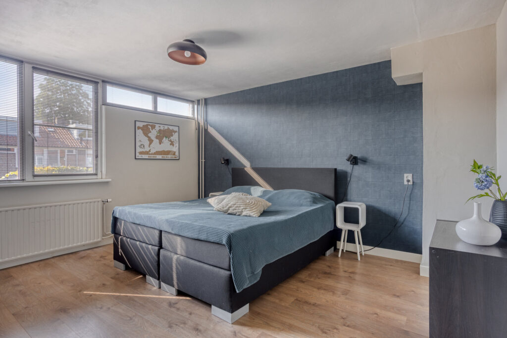 Slaapkamer I: 4,33m*3,58m= ca. 16m2 groot, voorzien van een nette laminaatvloer, stucwerk en behangen wanden en kunststof kozijnen met HR+ beglazing.