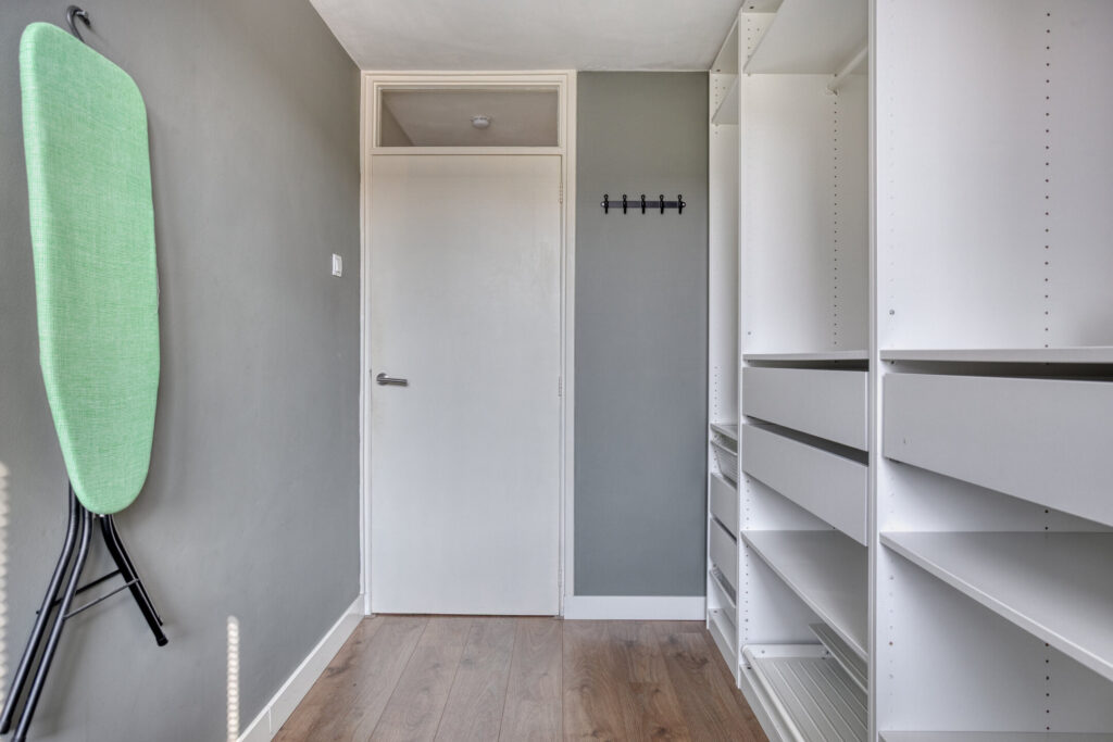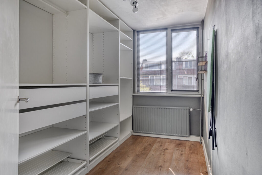 Slaapkamer III: nu ingedeeld als kastenkamer maar kan ook gebruikt worden als kinderkamer, 3,38m*2,09m= 5m groot, voorzien van een nette laminaatvloer, stucwerk wanden en kunststof kozijnen met HR+ beglazing.