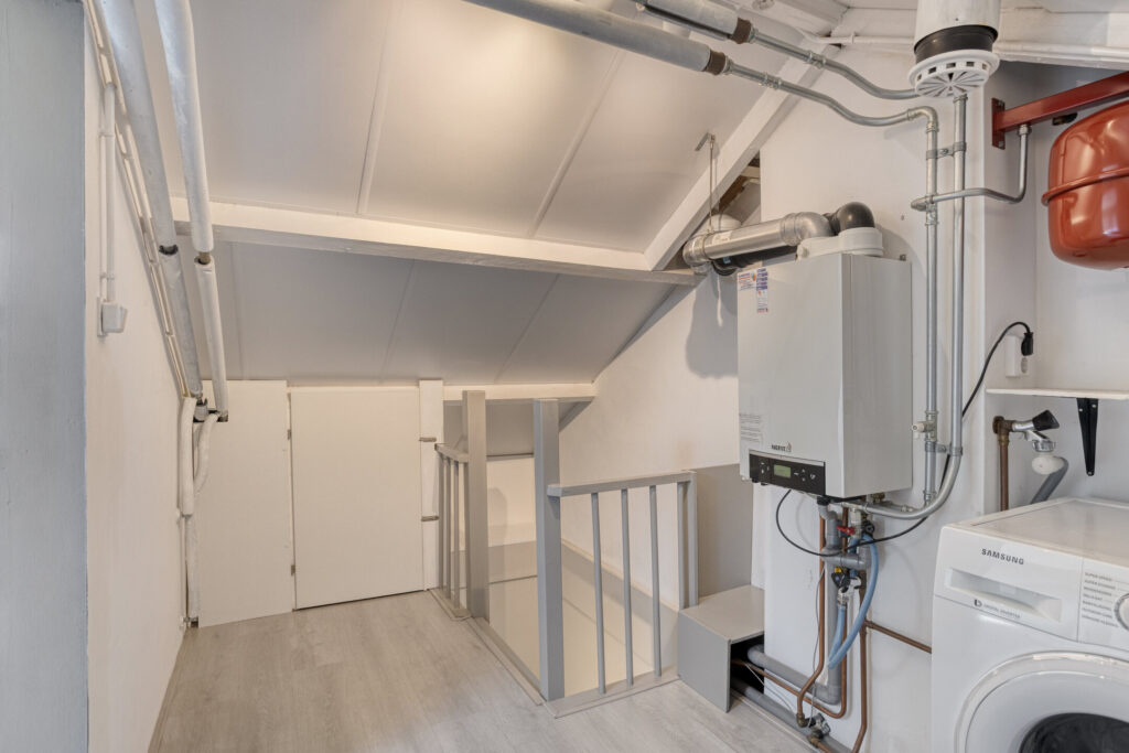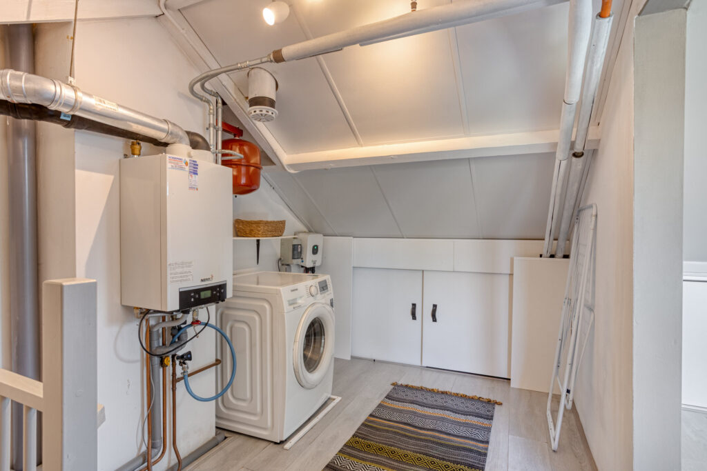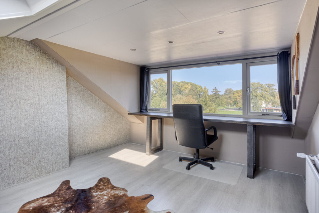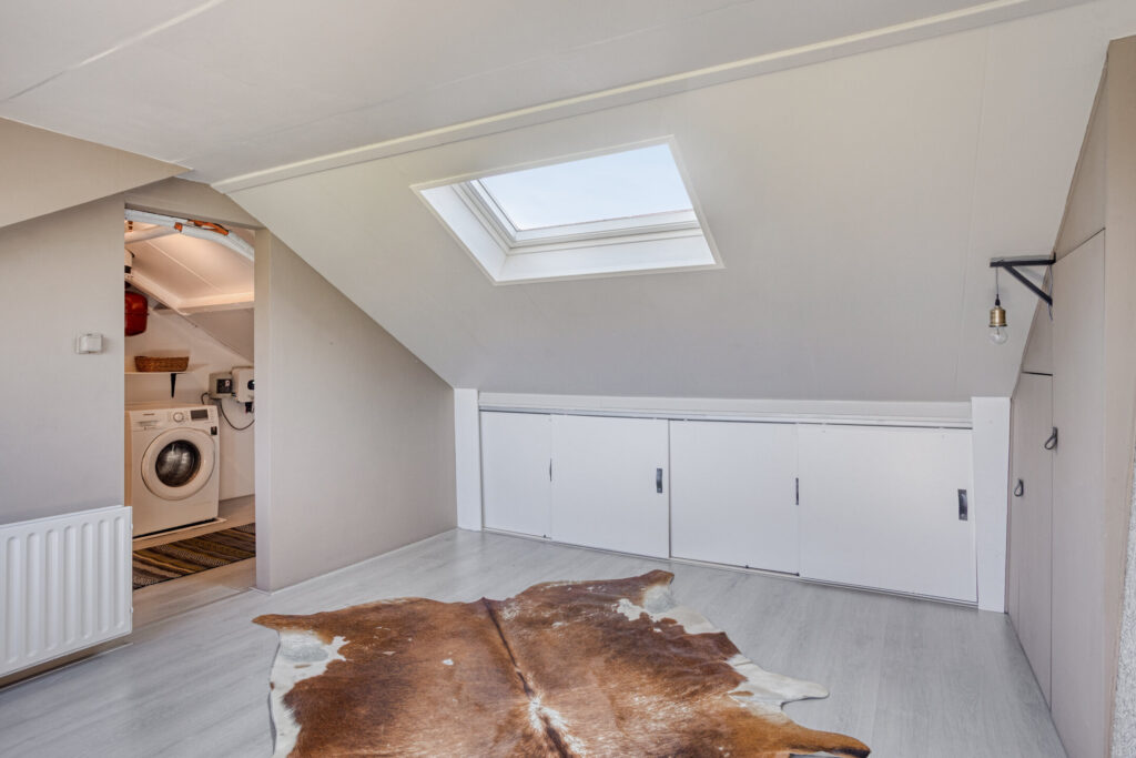 De tweede verdieping biedt een wasruimte met aansluiting voor wasmachine en droger, en een werkruimte die tevens als extra slaapkamer kan worden ingericht. Vanuit deze kamer geniet u van een prachtig uitzicht op het rustige, groene landschap rondom de woning. Op de voorzolder hangt de Cv ketel uit het jaar 2010.