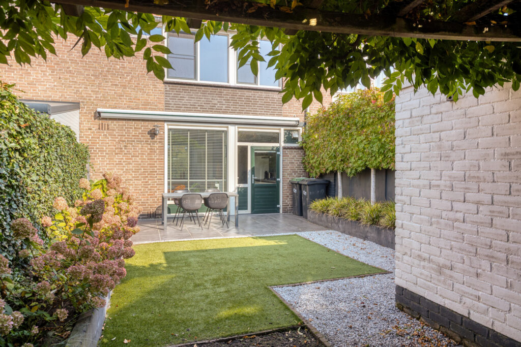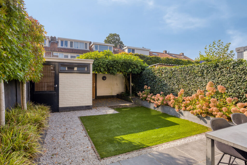 De op het zuiden gelegen tuin is verzorgd en netjes aangelegd en voorzien van borders met planten en leilinden (voor wat meer privacy), sierbestrating voor het terras en het pad naar de berging, zonneluifel, kunstgras veldje, berging en achterom. De berging is voorzien van elektra.