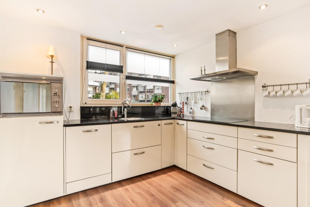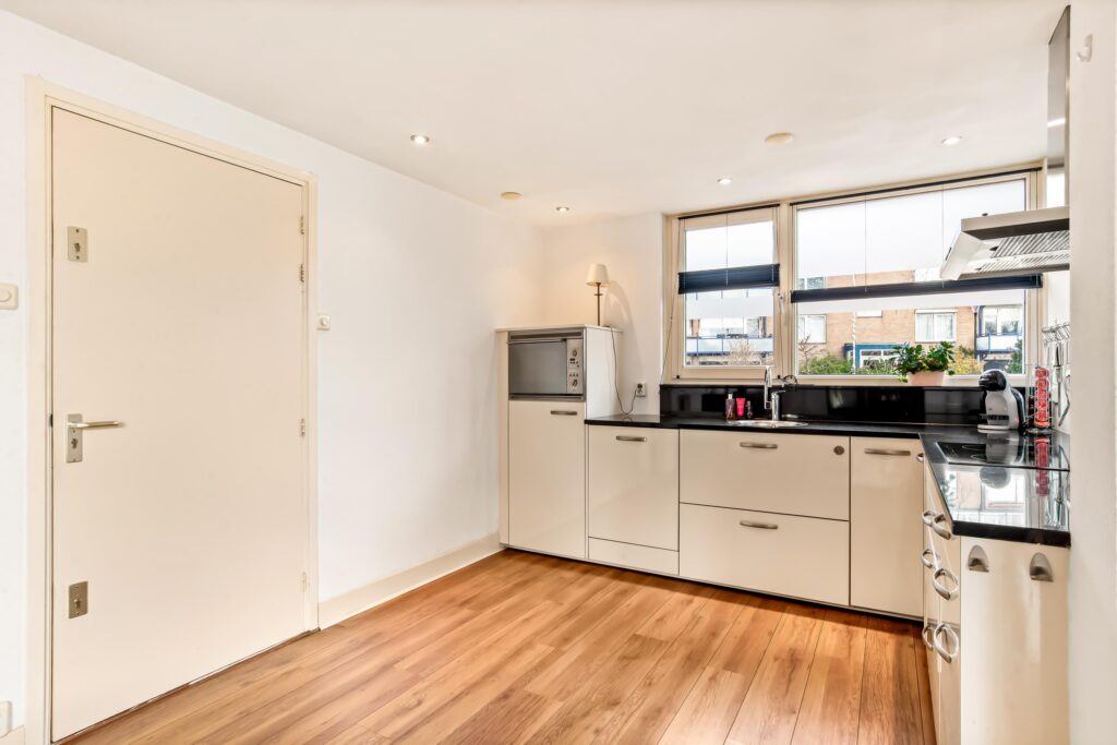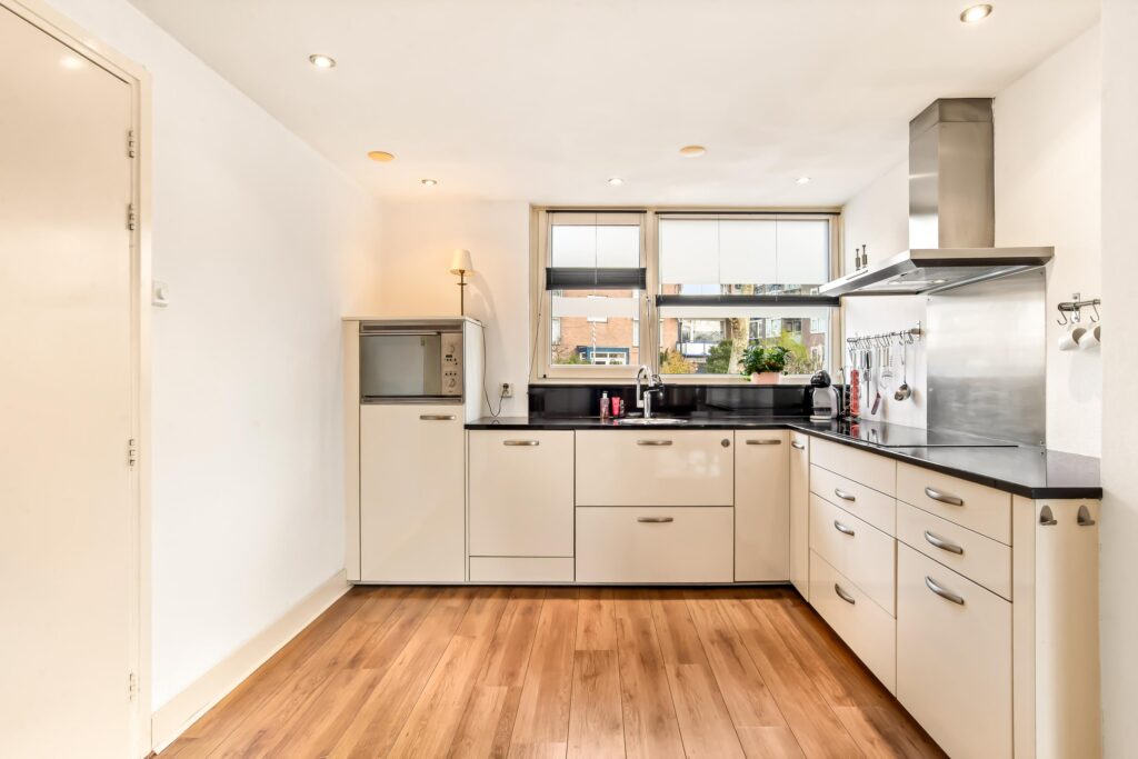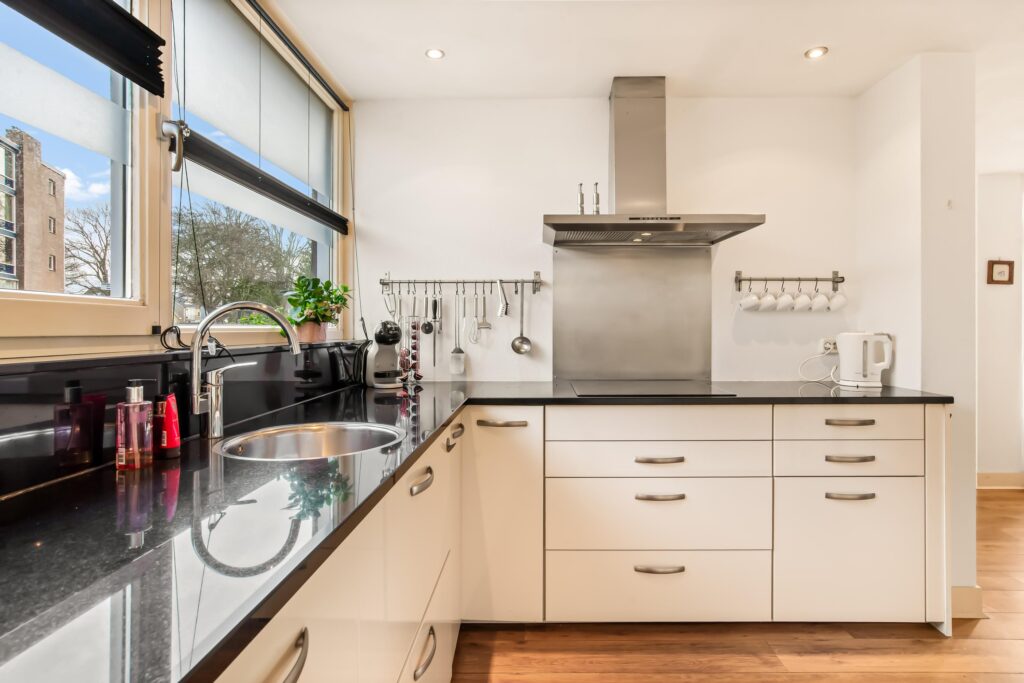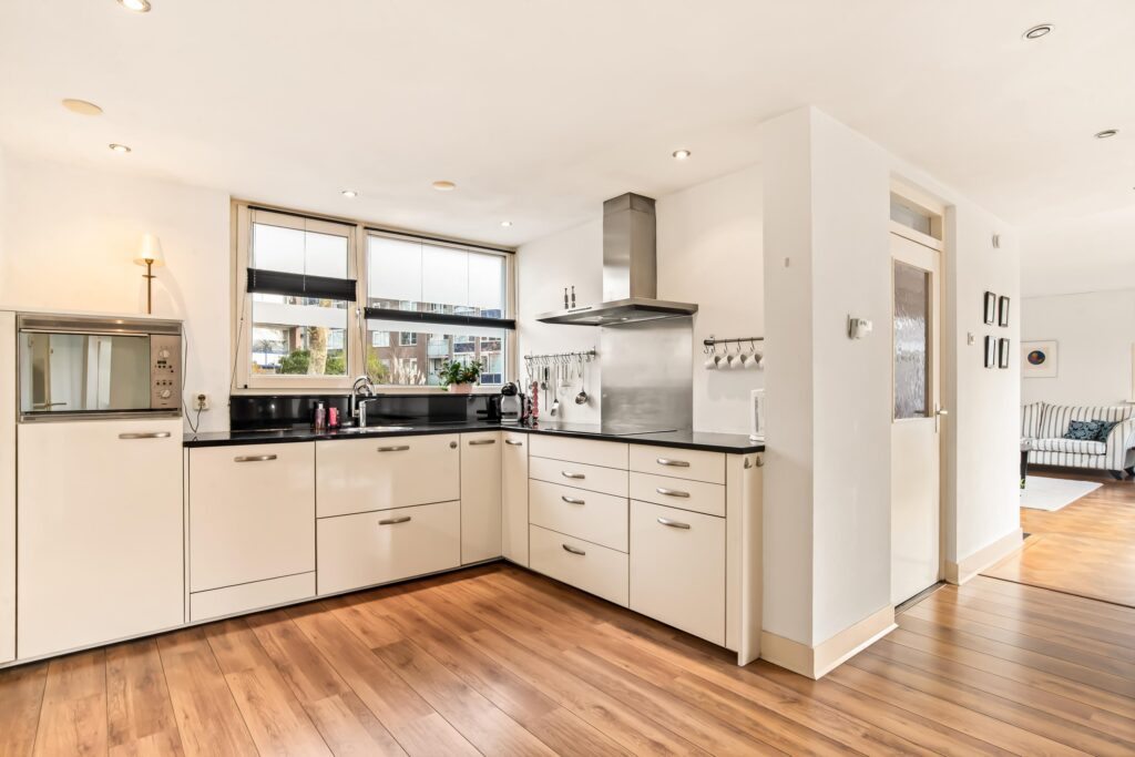 De open keuken is gelegen aan de voorzijde, uitgevoerd in een praktische hoekopstelling en voorzien van diverse inbouwapparatuur. Vanuit de keuken heeft u direct toegang tot de aangebouwde garage, waar zich ook de cv-ketel, wasmachine- en drogeropstelling bevinden.