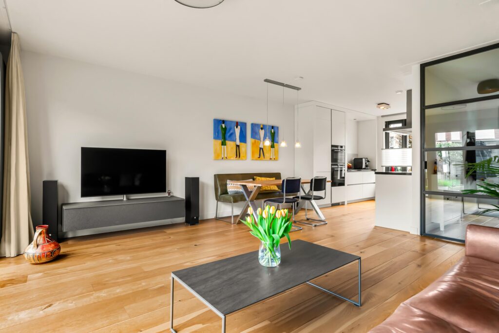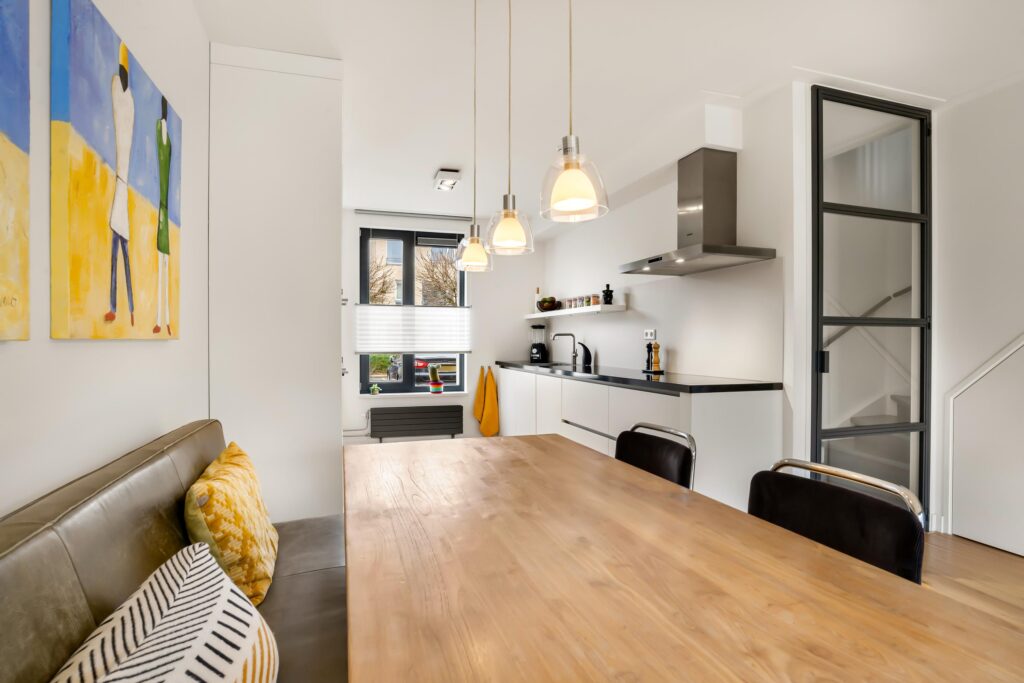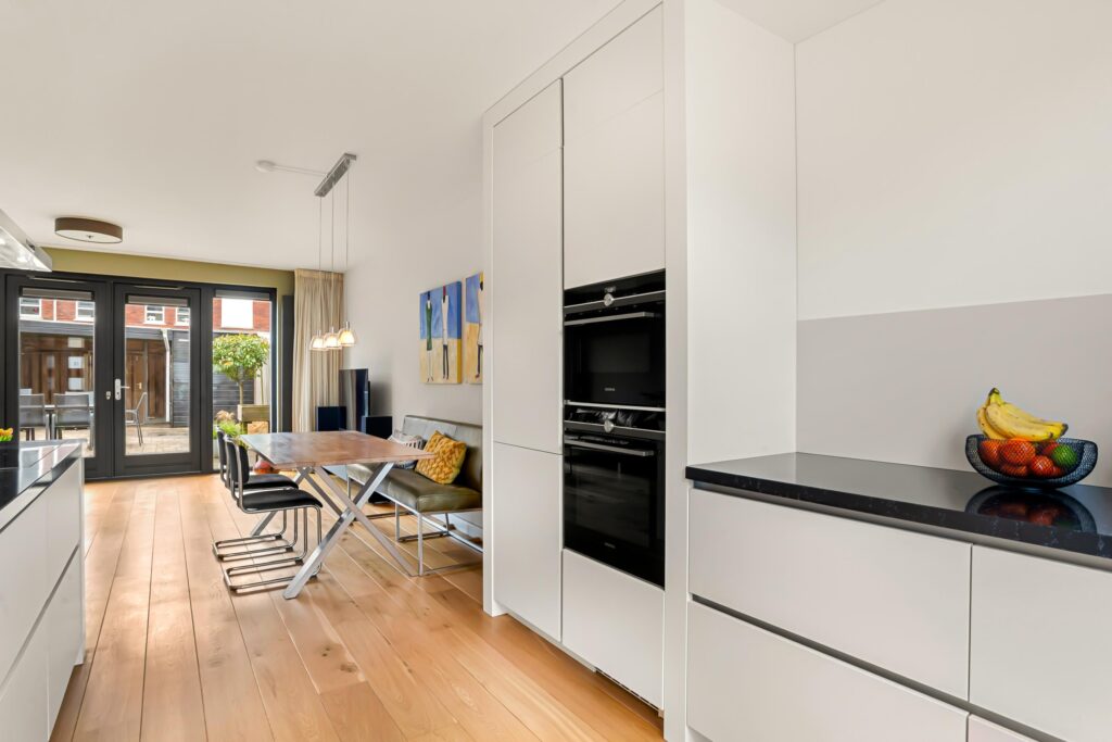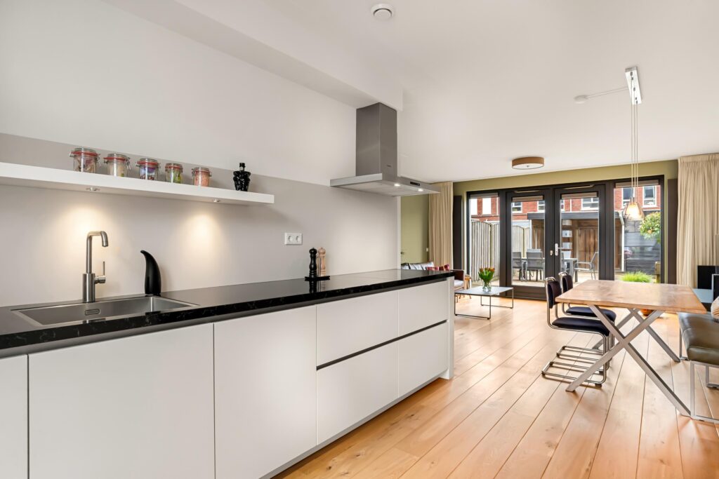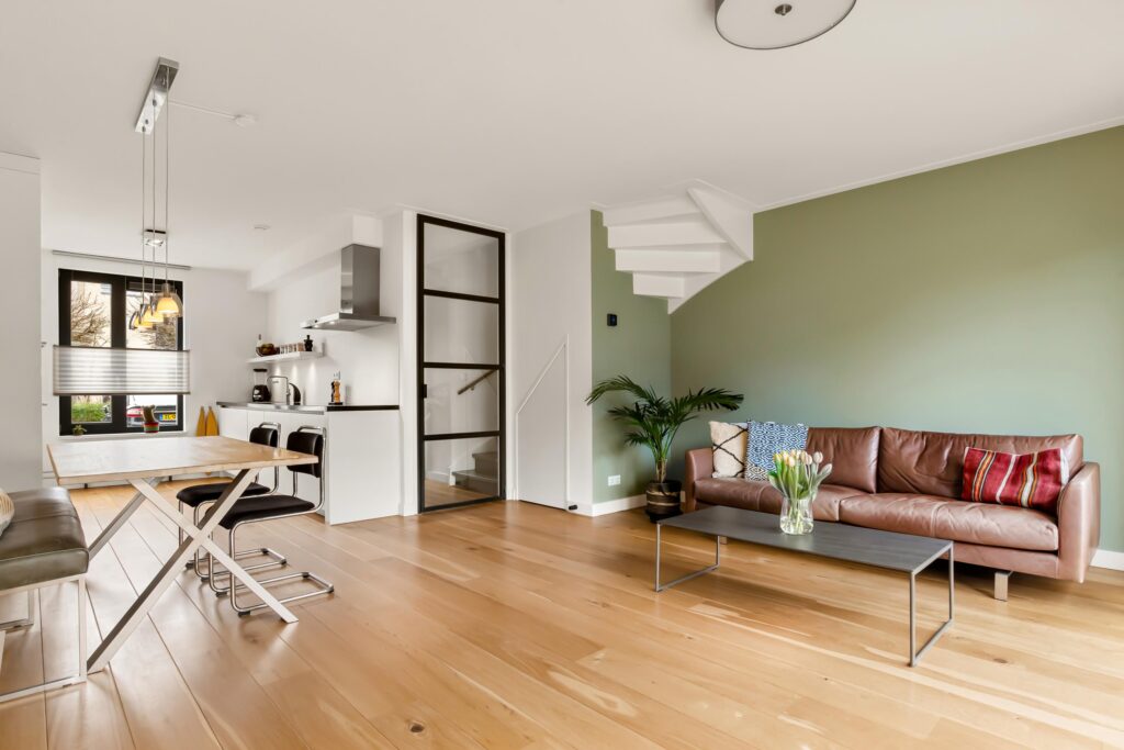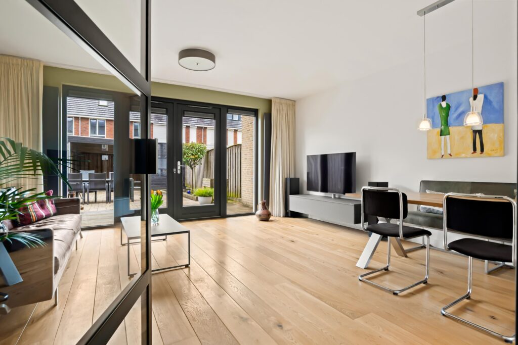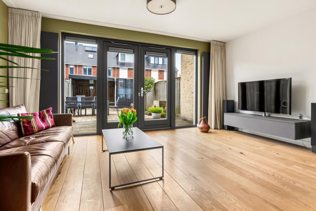 De tuingerichte woonkamer ademt rust en ruimte dankzij de strakke afwerking en de grote raampartij met openslaande deuren, die zorgen voor een overvloed aan daglicht en een fraai zicht op de achtertuin.
