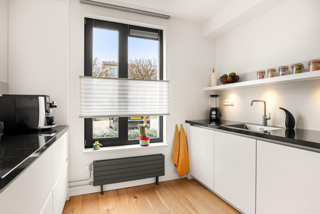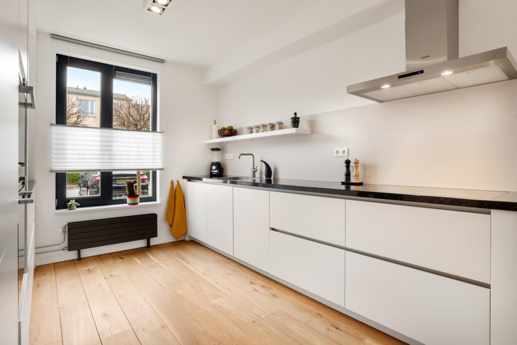 De strakke, moderne uitstraling van de buitenzijde wordt binnen moeiteloos doorgetrokken. Via de hal met strak gestuukte wanden en een eiken lamelparketvloer – doorgelegd over de gehele begane grond – betreedt u via een stijlvolle zwart stalen deur de lichte woonkamer met open keuken.