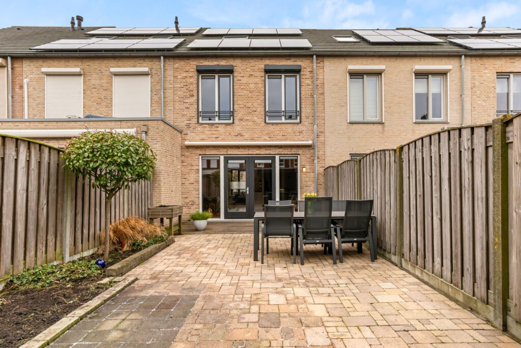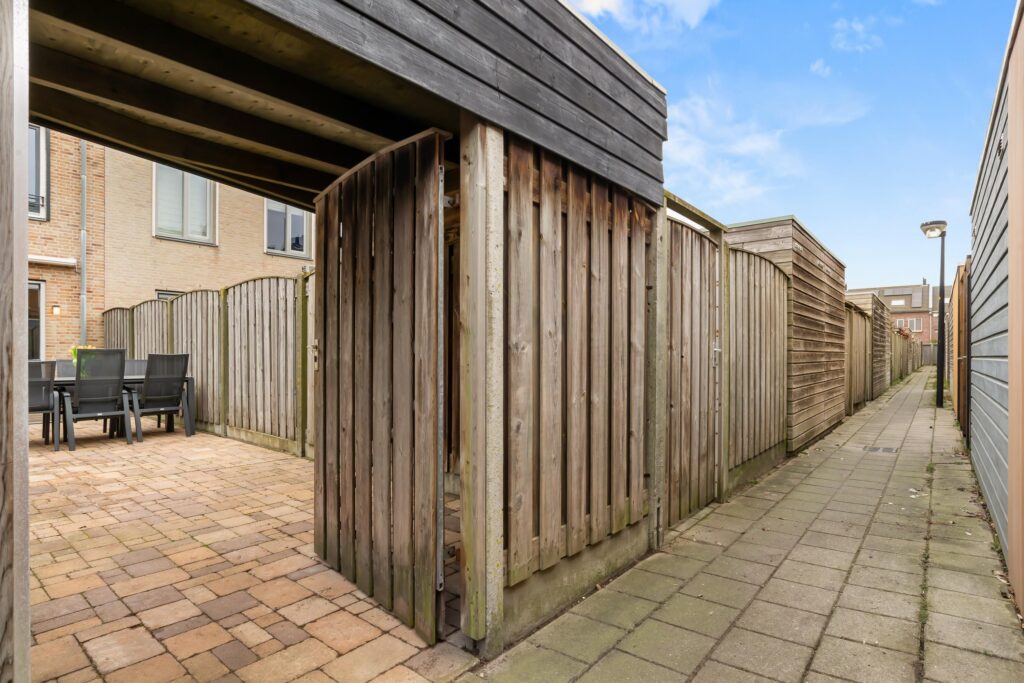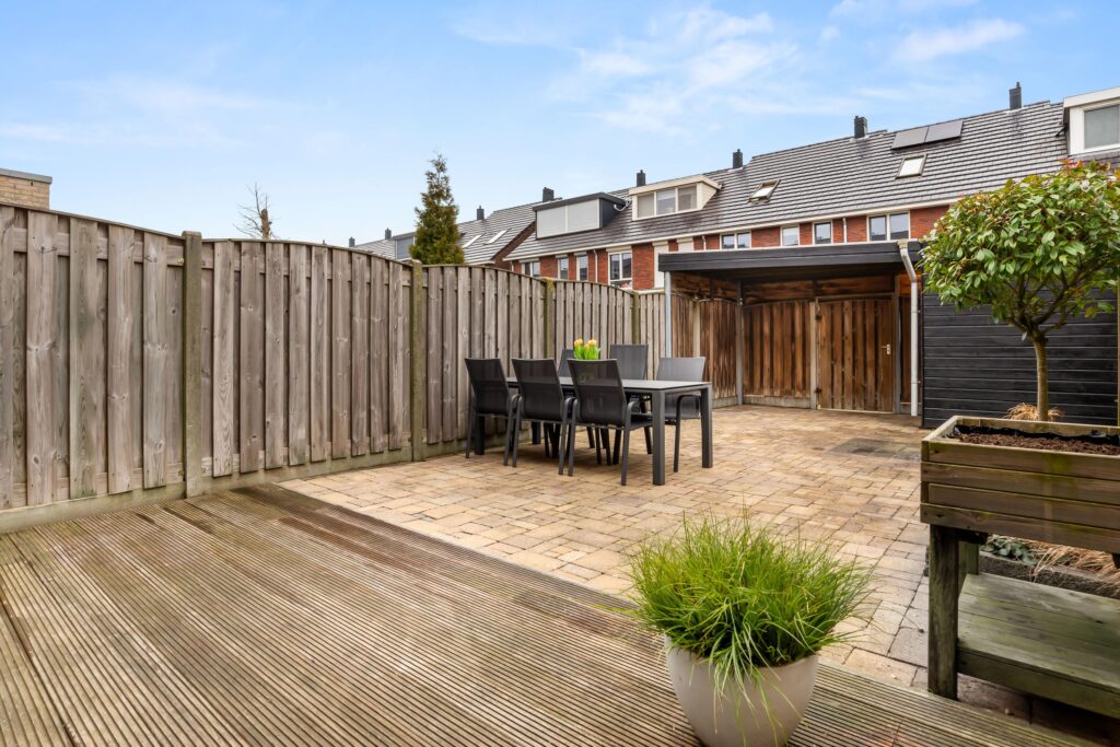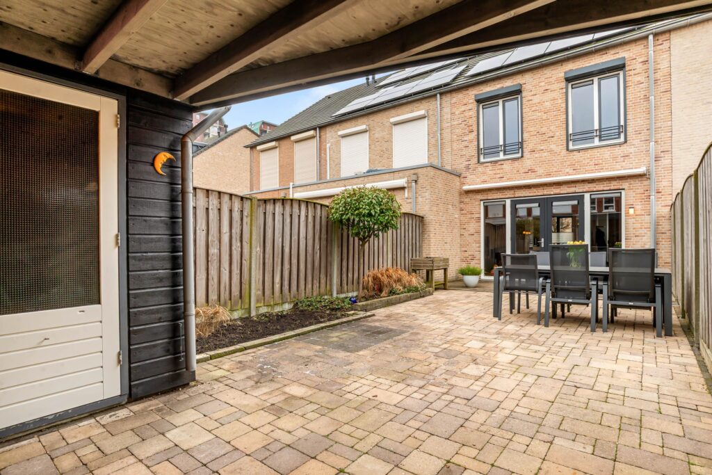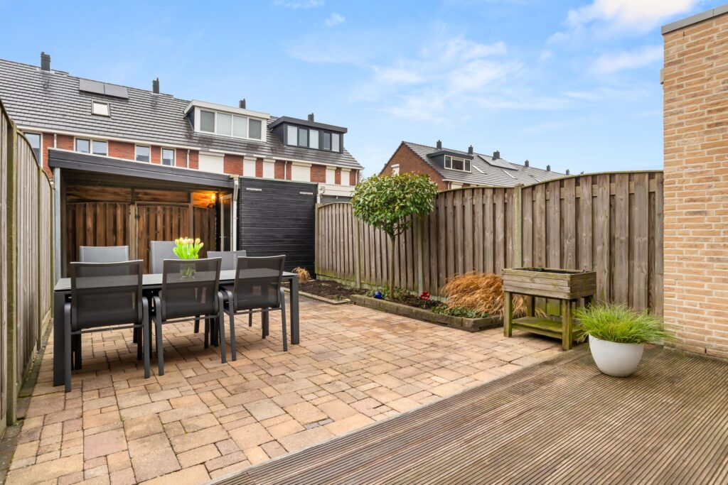 De zonnige achtertuin op het zuidoosten nodigt uit om de hele dag van de zon te genieten. Op warme dagen biedt het elektrische zonnescherm of de overkapping naast de schuur aangename schaduw. Fietsen en tuinmeubels bergt u netjes op in de houten berging.