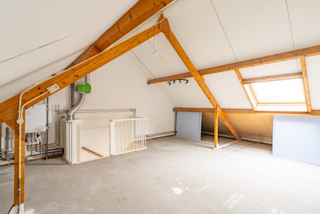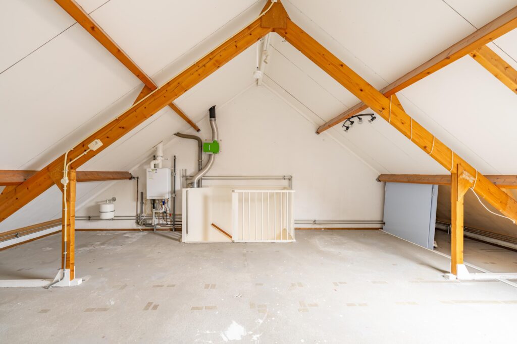 Via een vaste trap naar de 2e verdieping komt u op de ruime, open zolderetage met een Velux dakraam en verwarming. Hier bevinden zich de H.R.-combiketel, de unit t.b.v. de mechanische ventilatie en een aansluiting voor de wasmachine.
