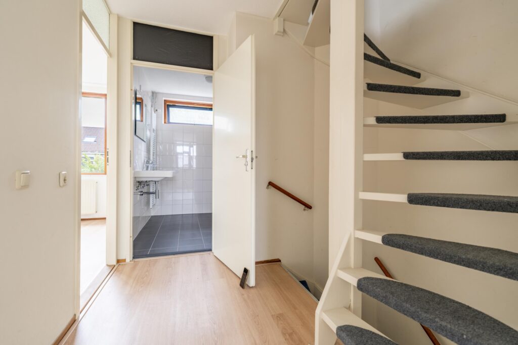 Vanuit de woonkamer komt u in een tussenportaal met de recent gerenoveerde toiletruimte met een wandcloset en fonteintje en de trapopgang naar de verdieping.