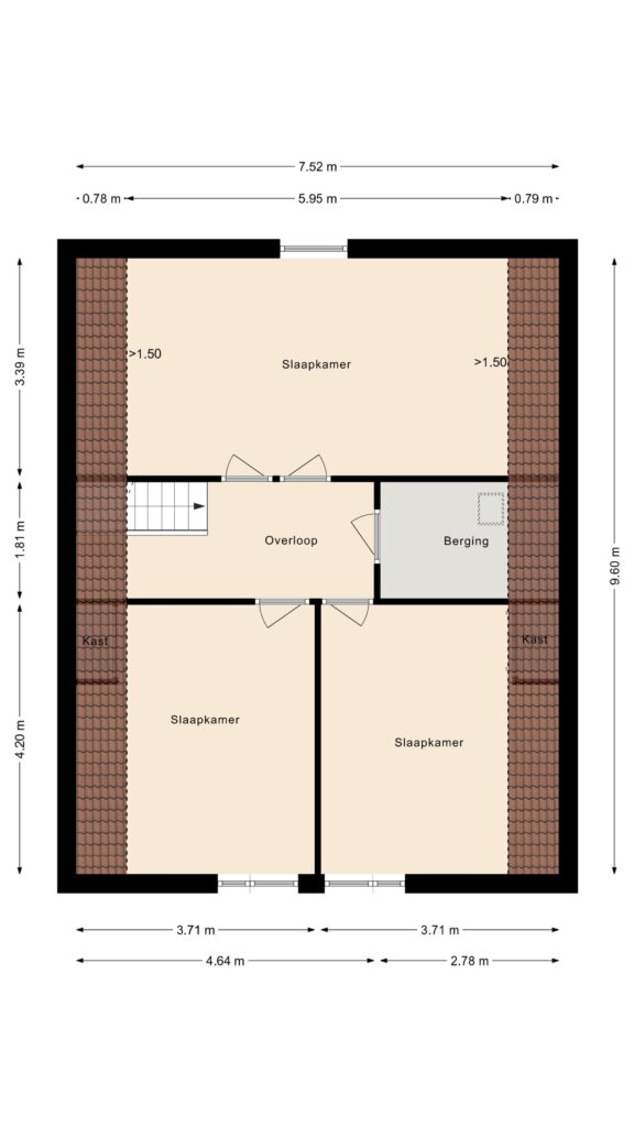 Eerste verdieping: overloop, drie slaapkamers en berging.