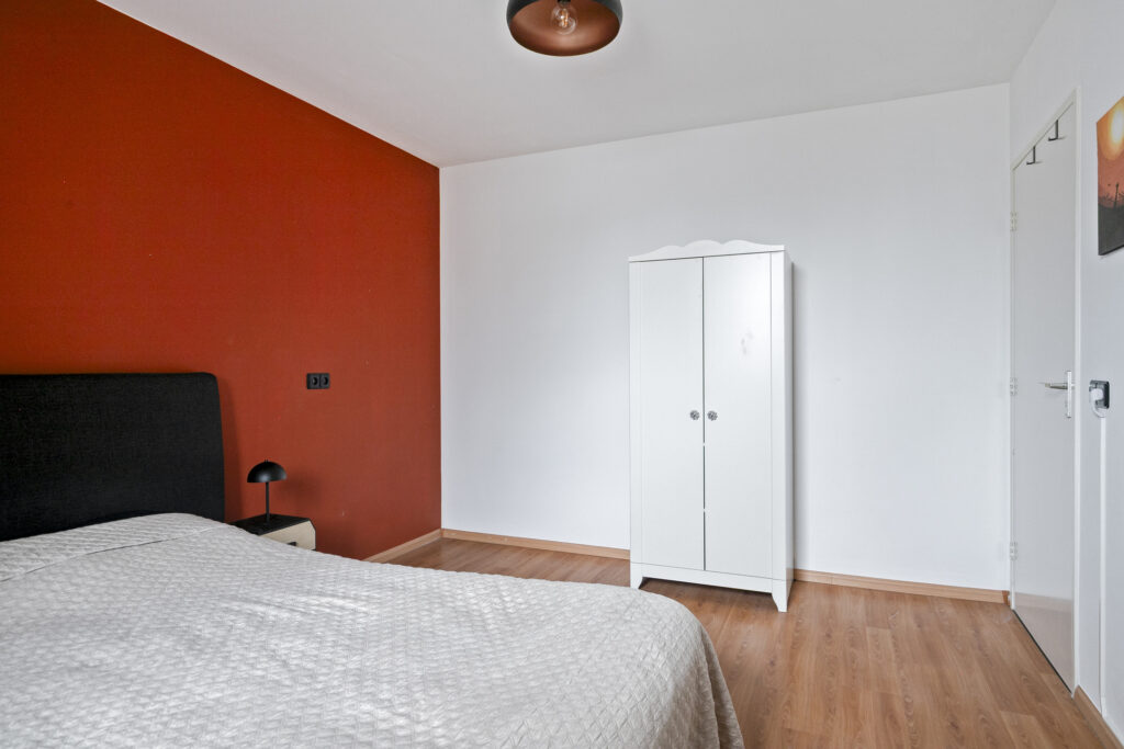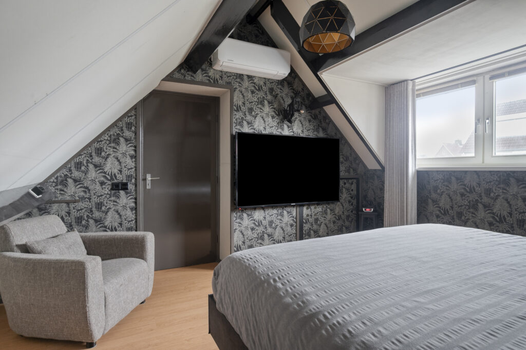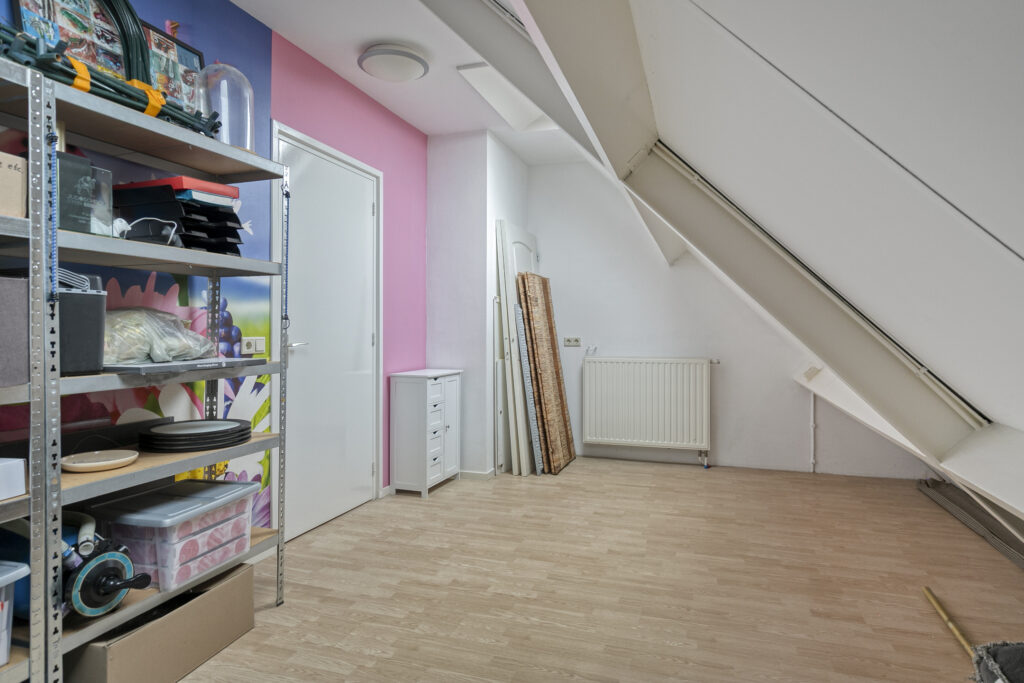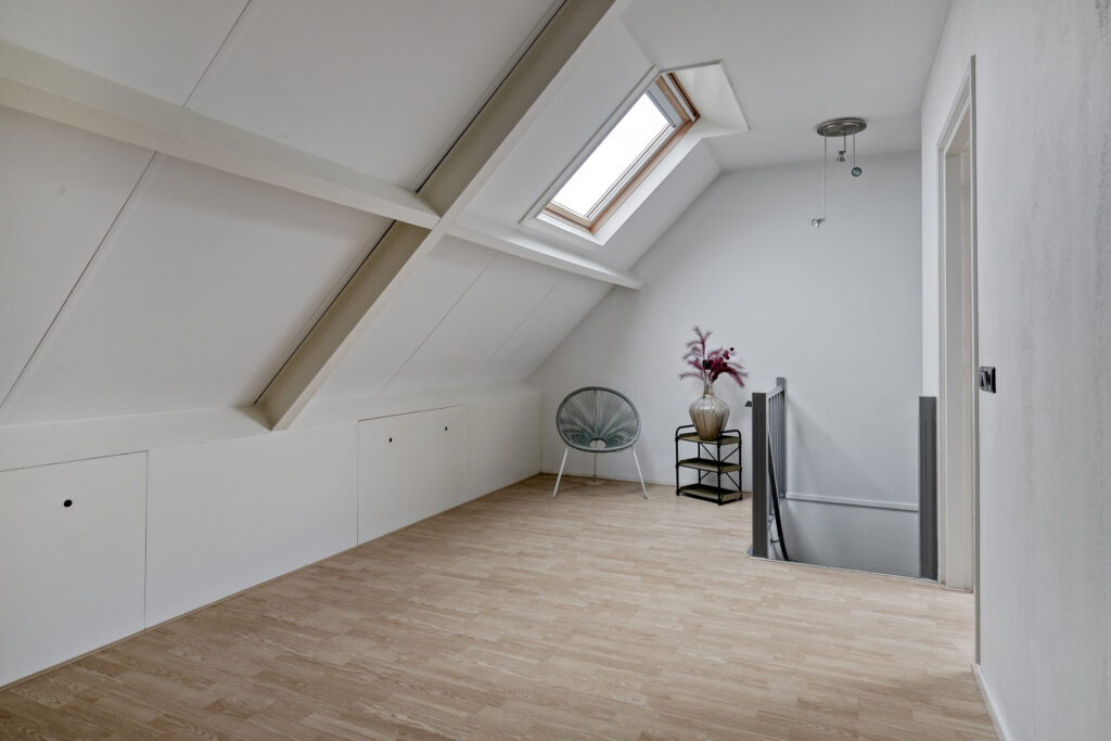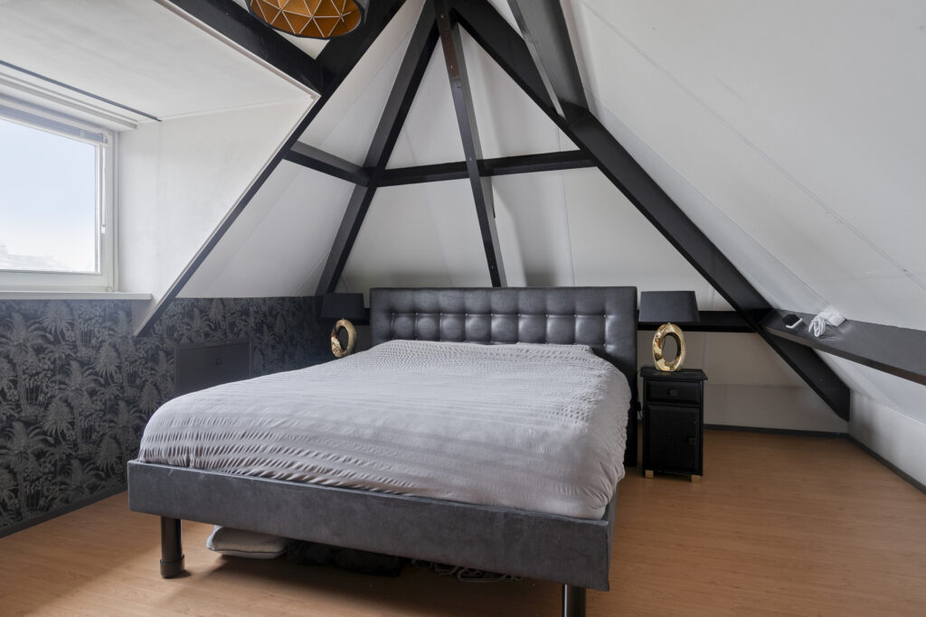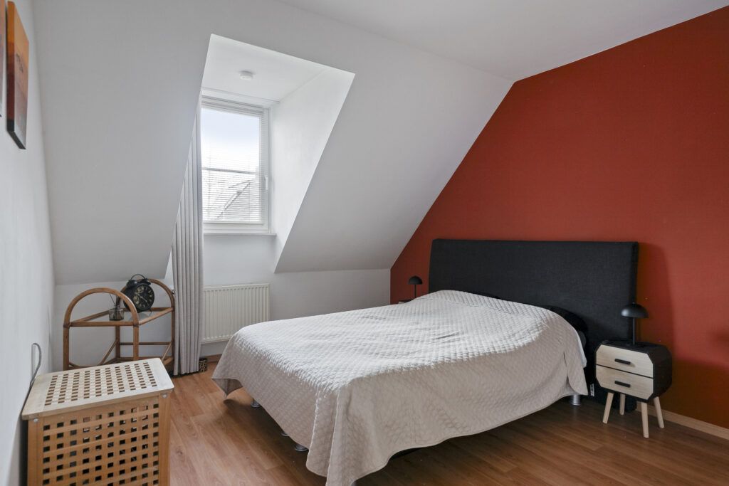 Slaapkamer I: De royale ouderslaapkamer is enorm sfeervol door het zichtbaar dakbeschot en de houten spanten. De kamer is afgewerkt met een laminaatvloer en lichte wandafwerking, gecombineerd met een accentwand van behang, wat een warme en moderne uitstraling geeft. De kamer biedt voldoende ruimte voor een tweepersoonsbed en aanvullende meubels. Dankzij de dakkapel geeft de ruimte een ruimtelijk gevoel en is er sprake van een prettige lichtinval. De kamer is voorzien van airconditioning, wat bijdraagt aan een comfortabel binnenklimaat gedurende alle seizoenen. Daarnaast is er bergruimte aanwezig in de knieschotten, waardoor de ruimte praktisch benut kan worden.