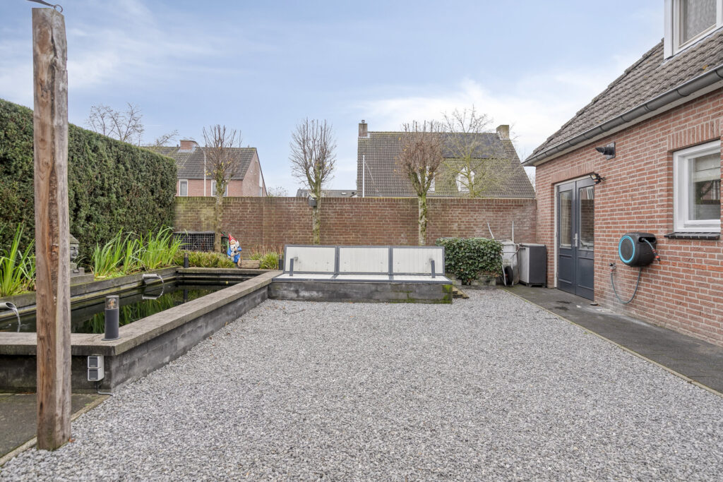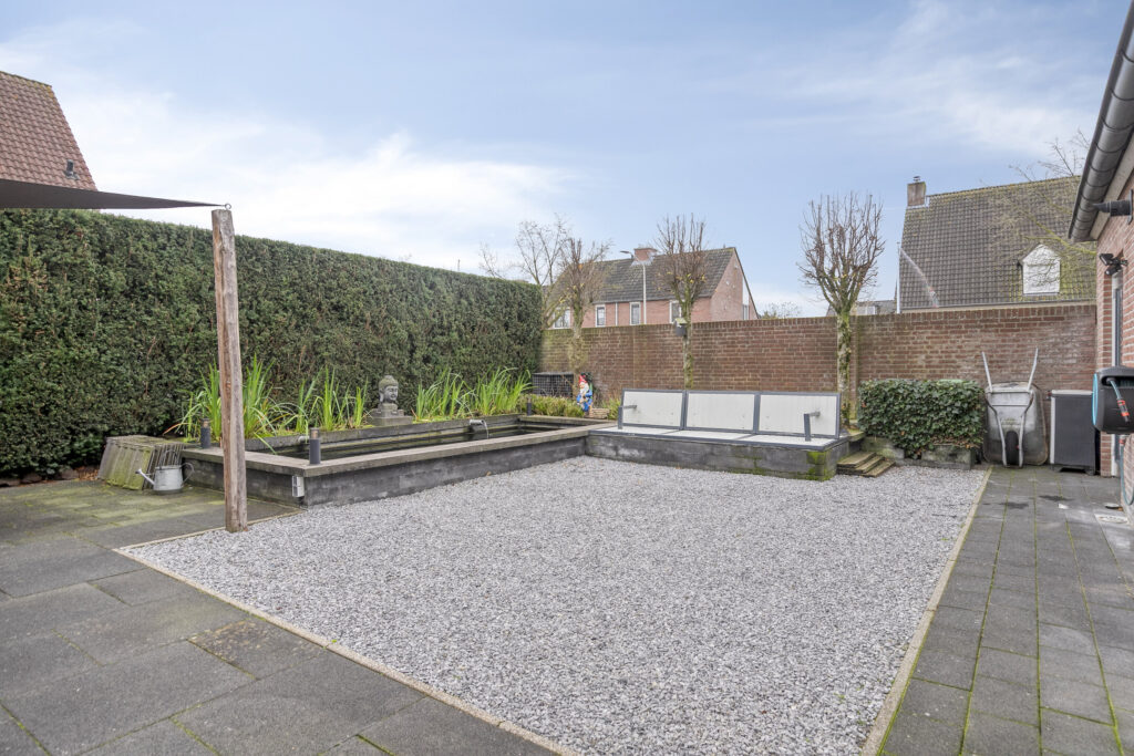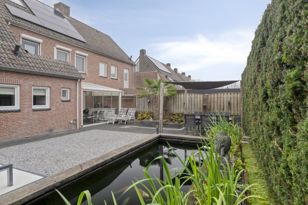 Centraal in de tuin bevindt zich een sfeervolle vijverpartij met verhoogde randen, die bijdraagt aan een rustige en groene beleving. Achter in de tuin is een tweede terras gesitueerd, voorzien van een schaduwdoek en ruimte voor een ruime eettafel, ideaal voor buiten dineren en ontspannen.