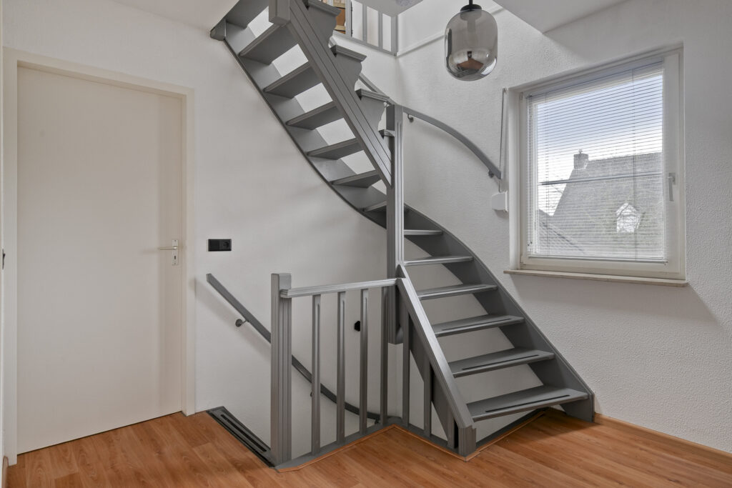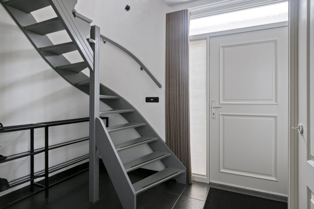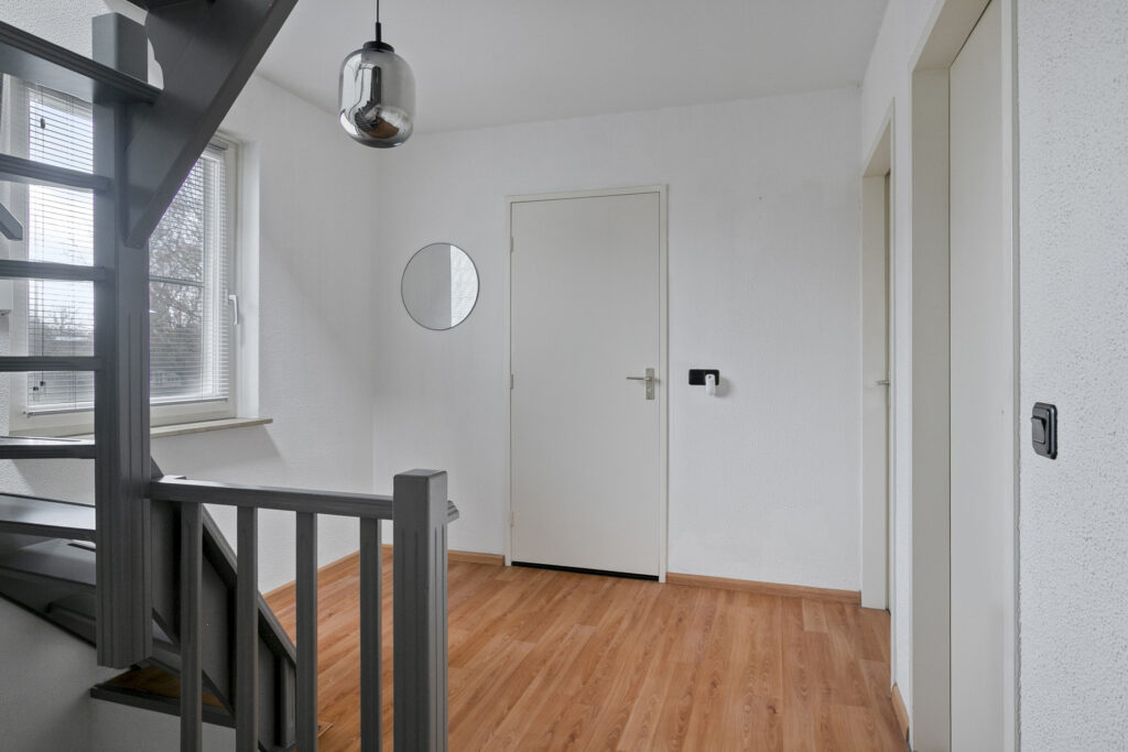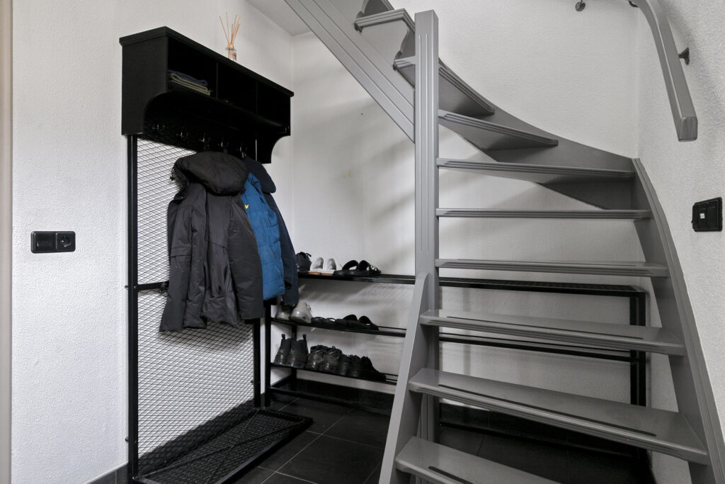De hal is verzorgd afgewerkt met een grijze tegelvloer en biedt toegang tot de meterkast, de trapopgang naar de eerste verdieping en de woonkamer. Door de ruime opzet is er voldoende ruimte voor een garderobe.