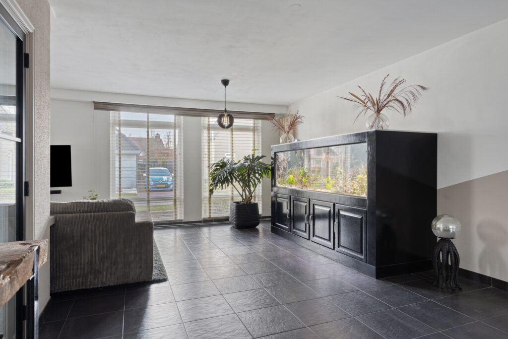 In het middengedeelte van de woonkamer is een grote aquariumkast geplaatst, een echte eye-catcher die ter overname wordt aangeboden.
