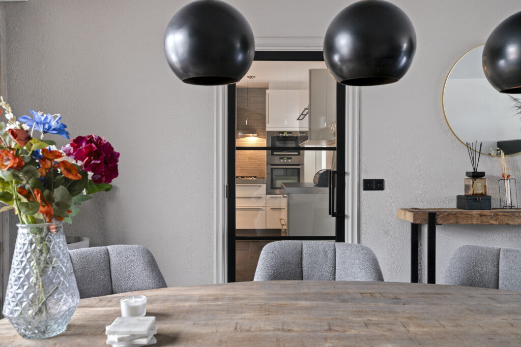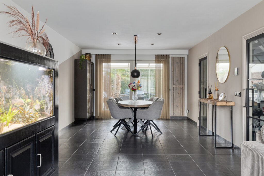 Aan de achterzijde bevindt zich de eethoek met plaats voor een grote eettafel, grenzend aan de tuinzijde. De grote schuifpui, voorzien van plisséhor, zorgen voor een fijne verbinding met de serre en de tuin.
