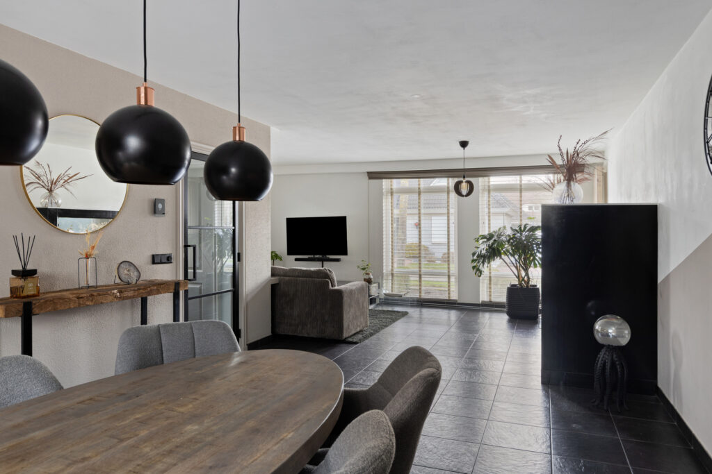 De royale woonkamer strekt zich uit over de volledige lengte van de woning en is opgedeeld in een comfortabel zitgedeelte aan de voorzijde en een ruime eethoek aan de achterzijde. Door de grote raampartijen aan zowel de voor- als achterzijde is er een prettige lichtinval en een open, ruimtelijk gevoel.