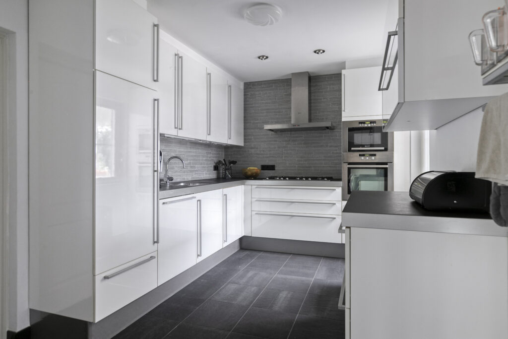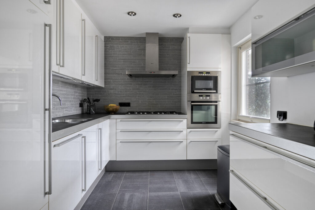 De keuken is gesitueerd in een separate ruimte en uitgevoerd in een moderne, lichte kleurstelling met hoogglans fronten en een donker werkblad. De keuken is opgesteld in een praktische L-vorm met kastenwand en biedt veel werk- en bergruimte. De keuken is voorzien van diverse inbouwapparatuur, waaronder een 6-pits gaskookplaat met RVS afzuigkap, een oven, een combimagnetron, een koelkast en een vaatwasser.
