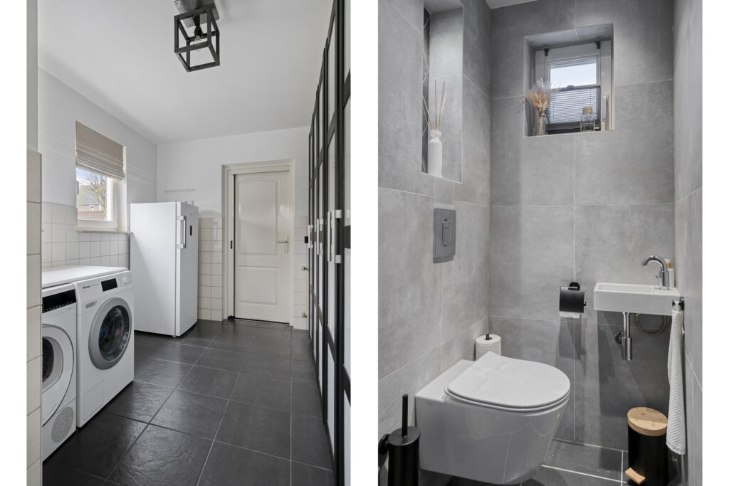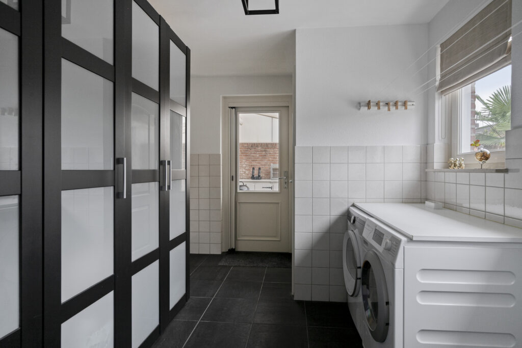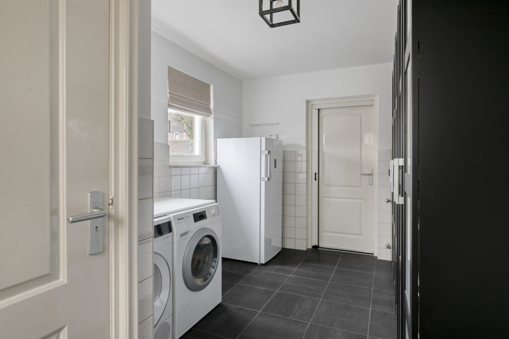 Aansluitend aan de keuken bevindt zich de praktische bijkeuken. Deze ruimte is afgewerkt met deels betegelde wanden en biedt plaats voor de wasmachine en droger. Daarnaast is er ruimte voor een extra koelkast of vriezer en voldoende bergruimte voor huishoudelijke spullen.