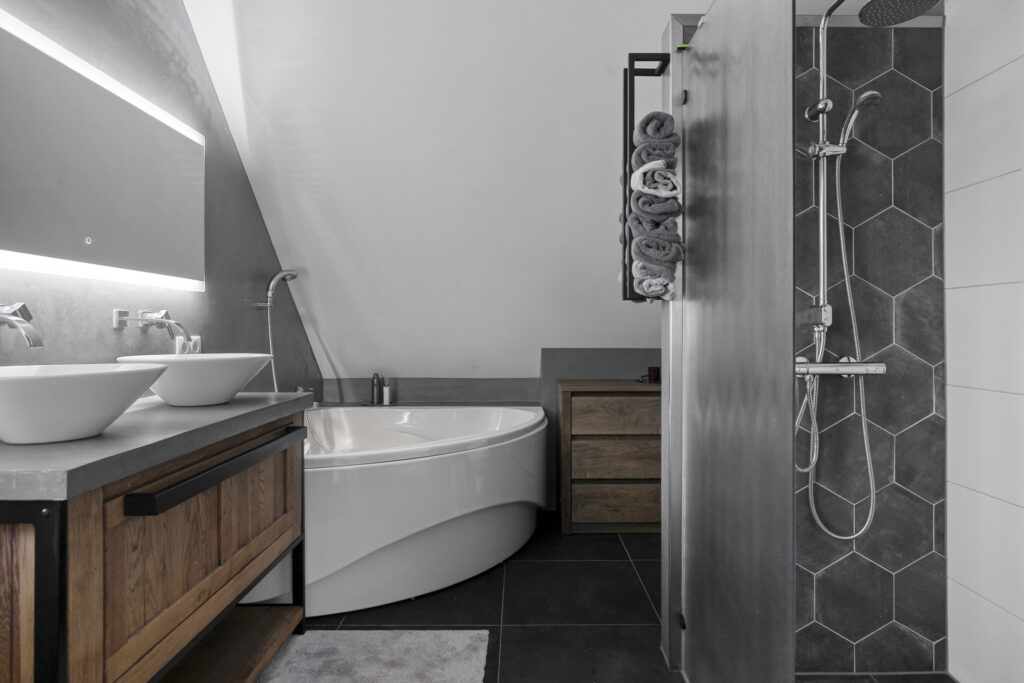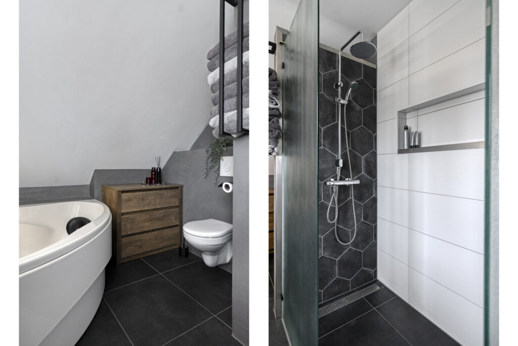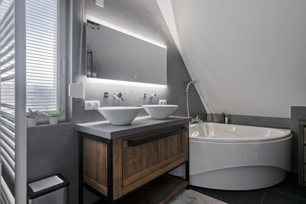 De luxe badkamer is recent gemoderniseerd en zeer compleet. De ruimte is afgewerkt met een tegelvloer (met vloerverwarming) en strak gestucte wanden in een grijze kleurstelling, wat zorgt voor een warme en rustige uitstraling. De badkamer is ingericht met een hoekligbad, een ruime inloopdouche met regendouche, hangcloset, designradiator, een houten wastafelmeubel met twee waskommen en spiegel met geïntegreerde verlichting. Het raam, voorzien van een hor, zorgt voor veel daglicht en de mogelijkheid tot natuurlijke ventilatie.
