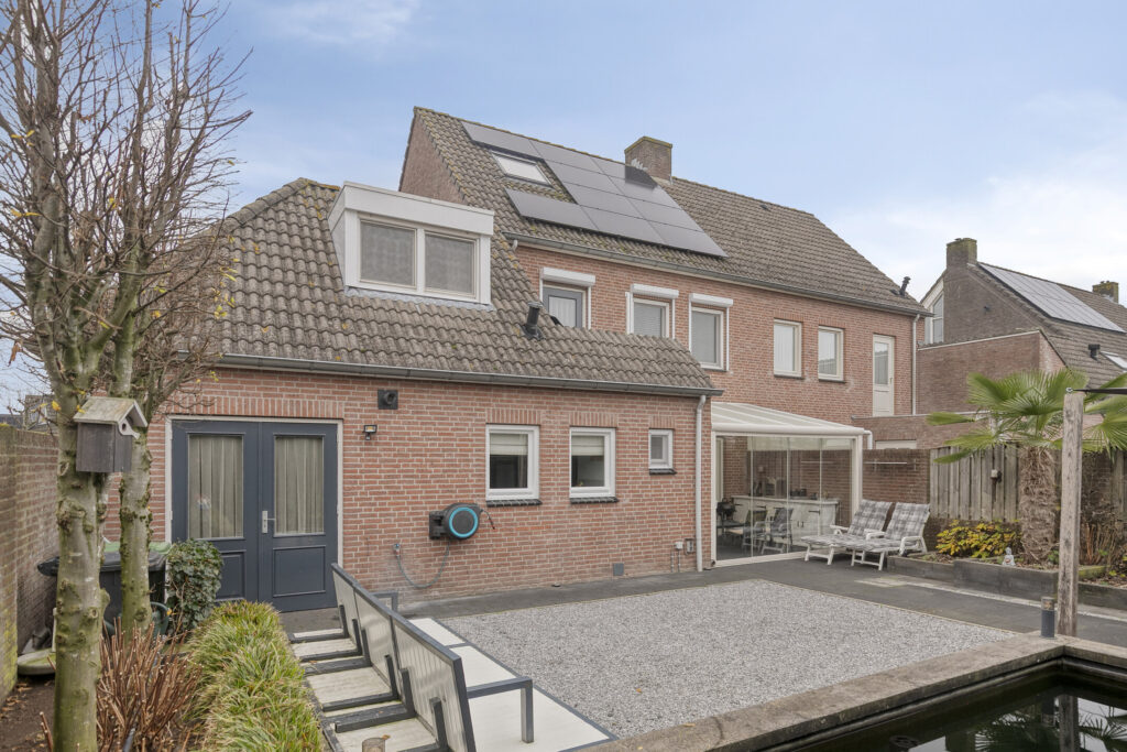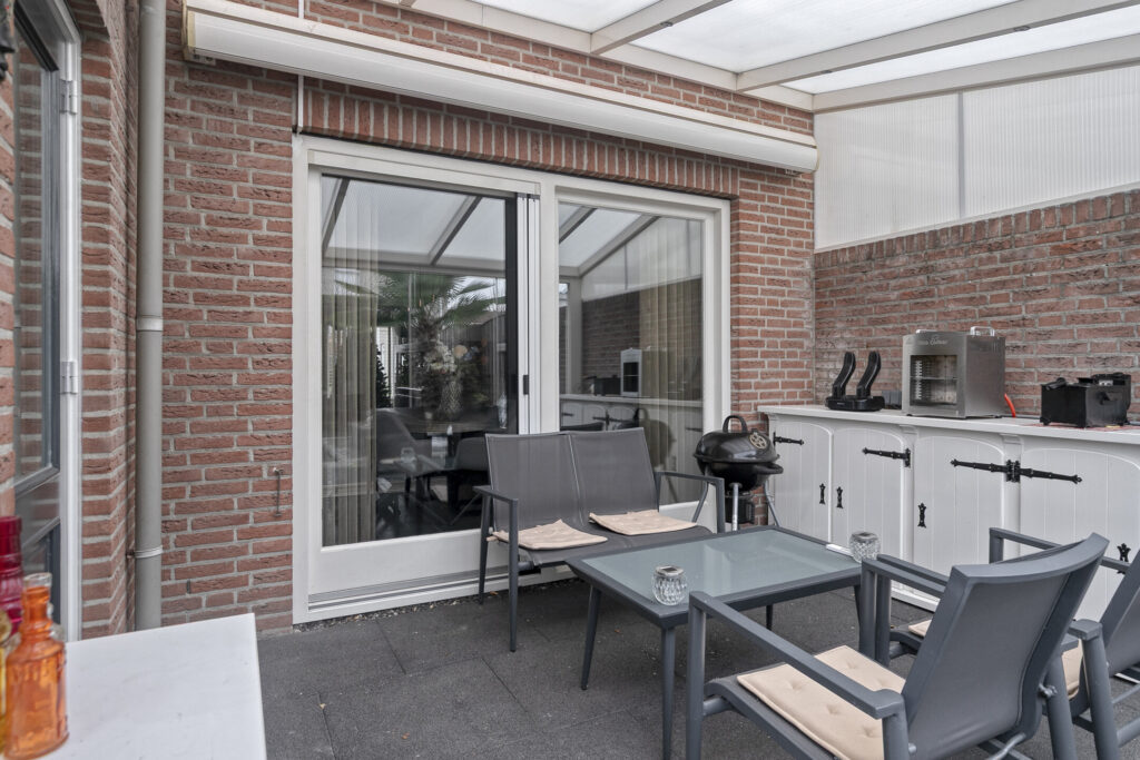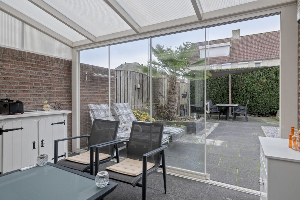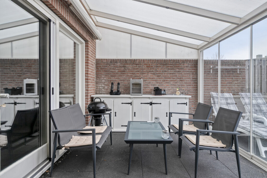 Aan de achterzijde van de woning bevindt zich een fraaie serre, direct grenzend aan de woonkamer. Deze ruimte is uitgevoerd met een lichtdoorlatende dakconstructie en glazen schuifwanden, waardoor er een prettige verbinding ontstaat tussen binnen en buiten.