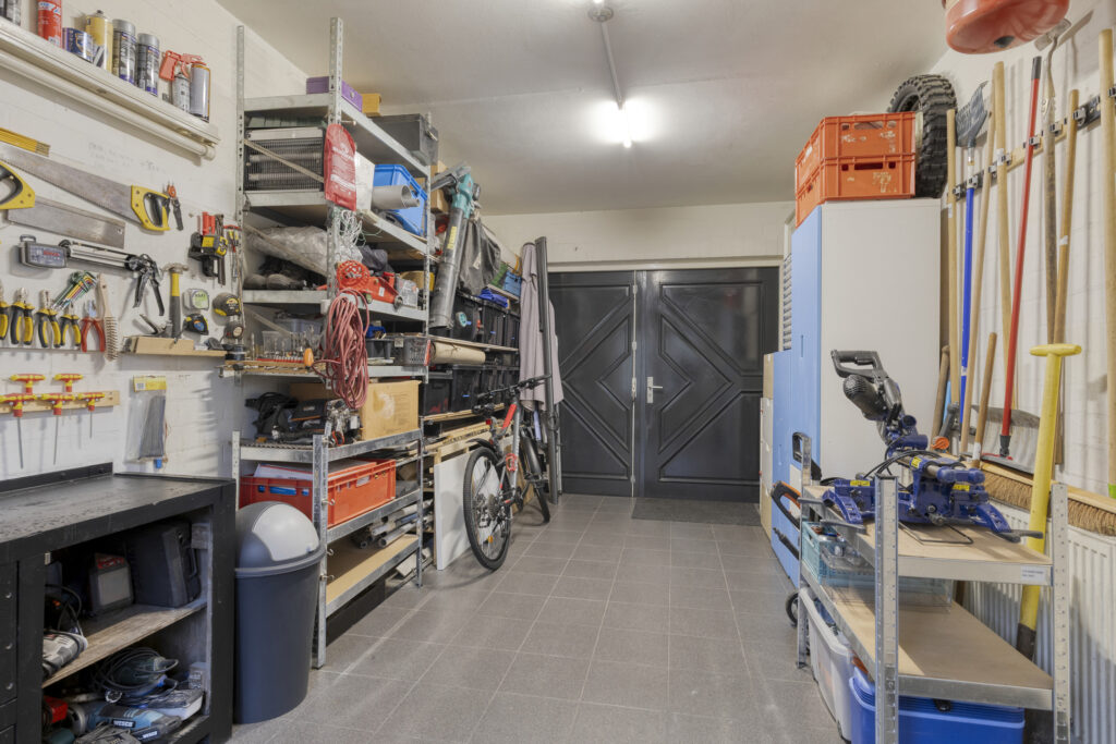 De ruimte biedt volop mogelijkheden voor het stallen van een auto, fietsen en het opslaan van spullen, maar is ook uitstekend geschikt als hobby- of werkruimte. Langs de wanden is voldoende plaats voor stellingen en werkbanken, waardoor de garage praktisch en functioneel is ingericht.