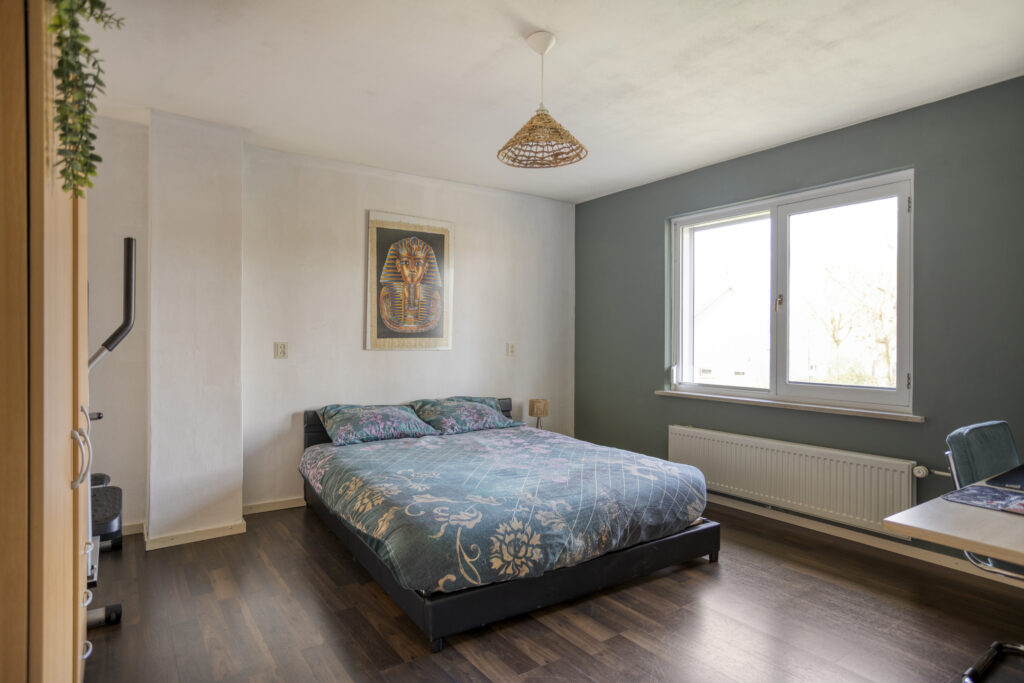 De grote raampartij zorgt voor veel daglicht en een fijn uitzicht over de straat. De kamer biedt voldoende ruimte voor een tweepersoonsbed, kledingkast en bureau, en is daarmee ideaal als tienerkamer, logeerkamer of thuiswerkplek.