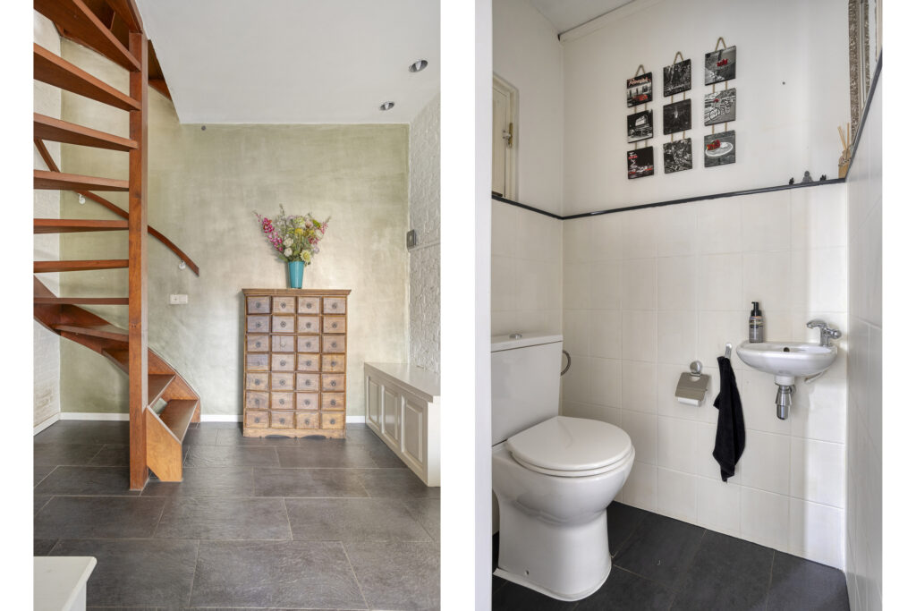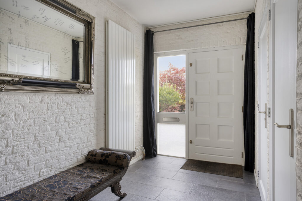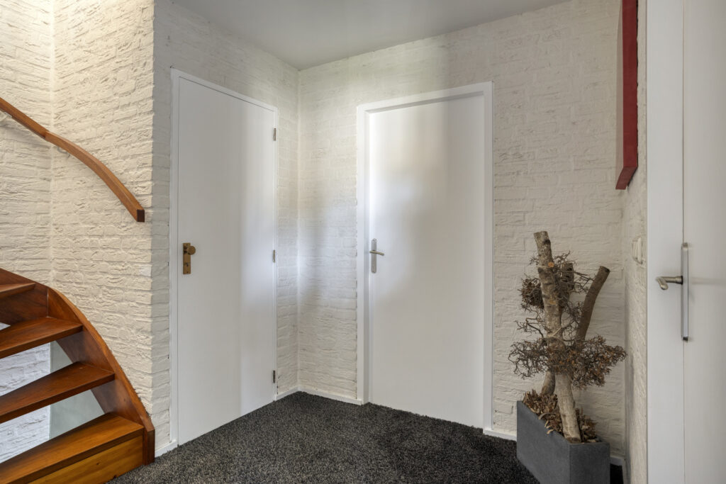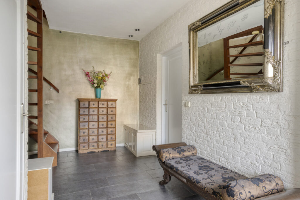 Hier bevindt zich tevens de achterdeur naar de tuin, waardoor deze ruimte zich perfect leent als praktische entree en opbergplek voor schoenen, jassen en tassen.