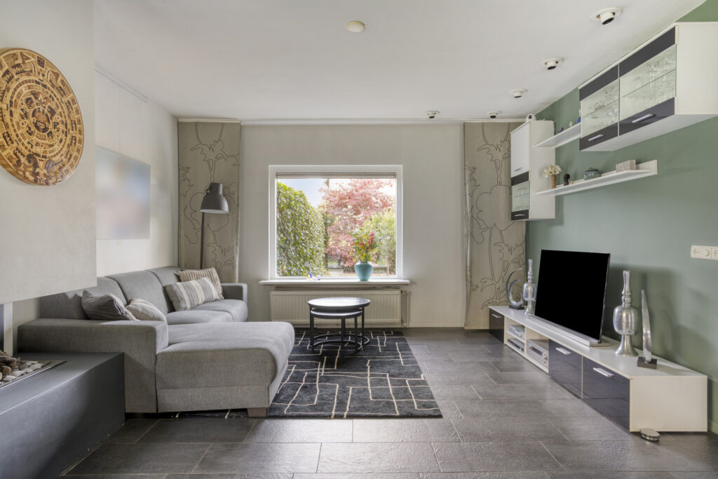 De riante woonkamer is een heerlijke leefruimte met een open en lichte uitstraling. Grote raampartijen aan zowel de voor- als achterzijde zorgen voor een overvloed aan daglicht en een fijn contact met de tuin. De ruimte is keurig afgewerkt met een donkere tegelvloer, gestuukte wanden en een strak plafond met inbouwspots, wat zorgt voor een moderne en verzorgde uitstraling.