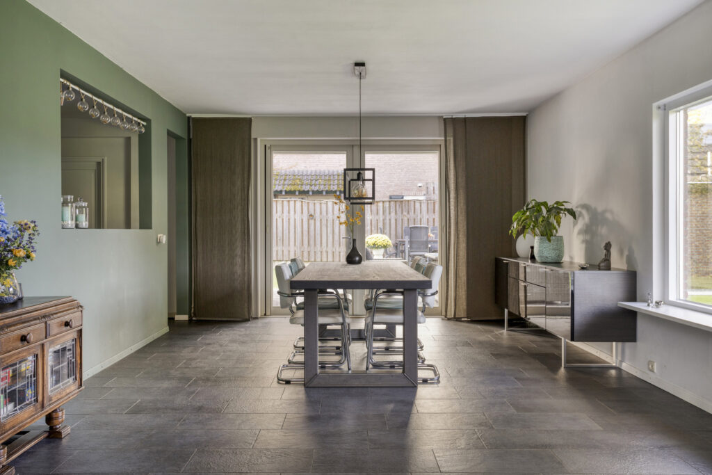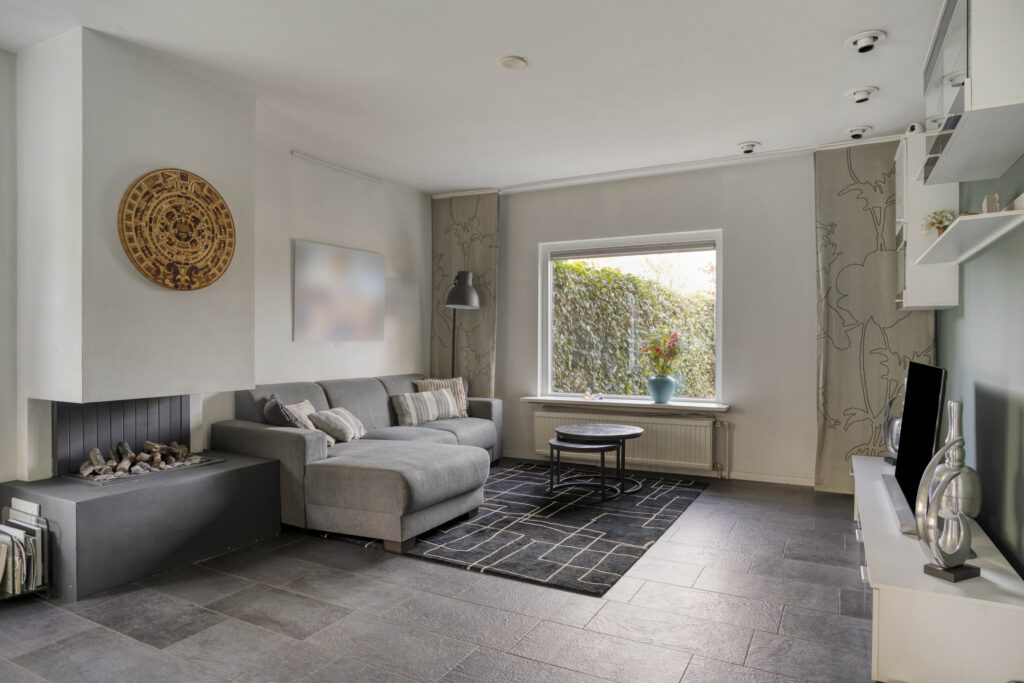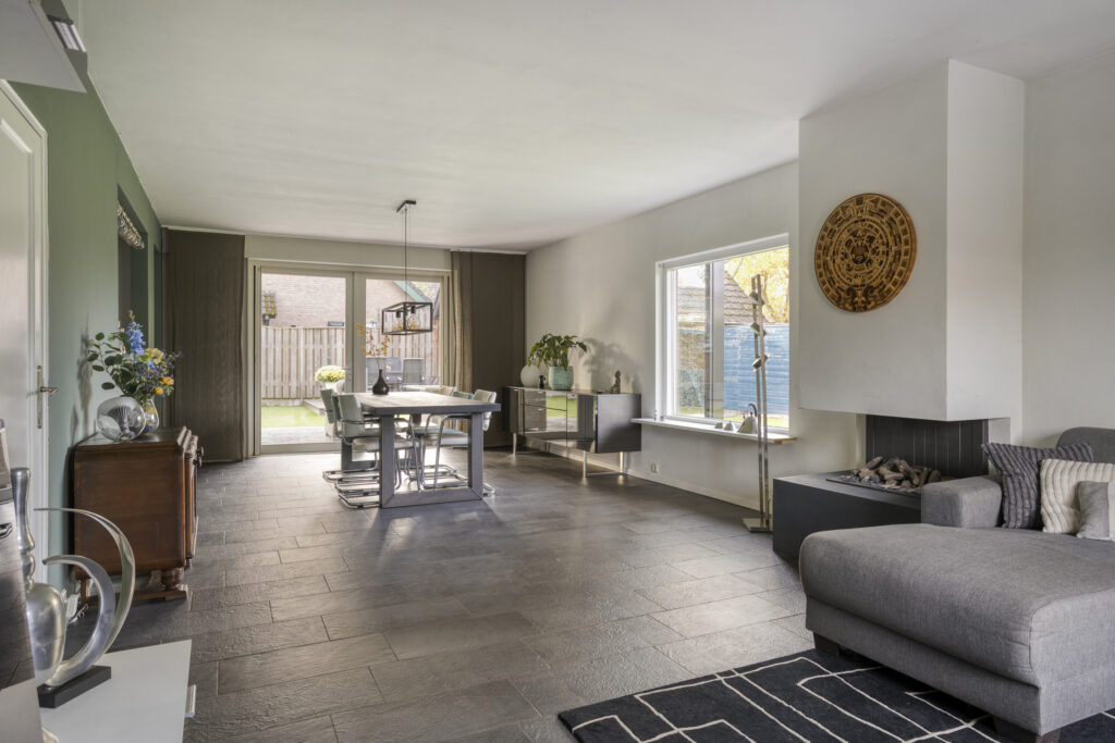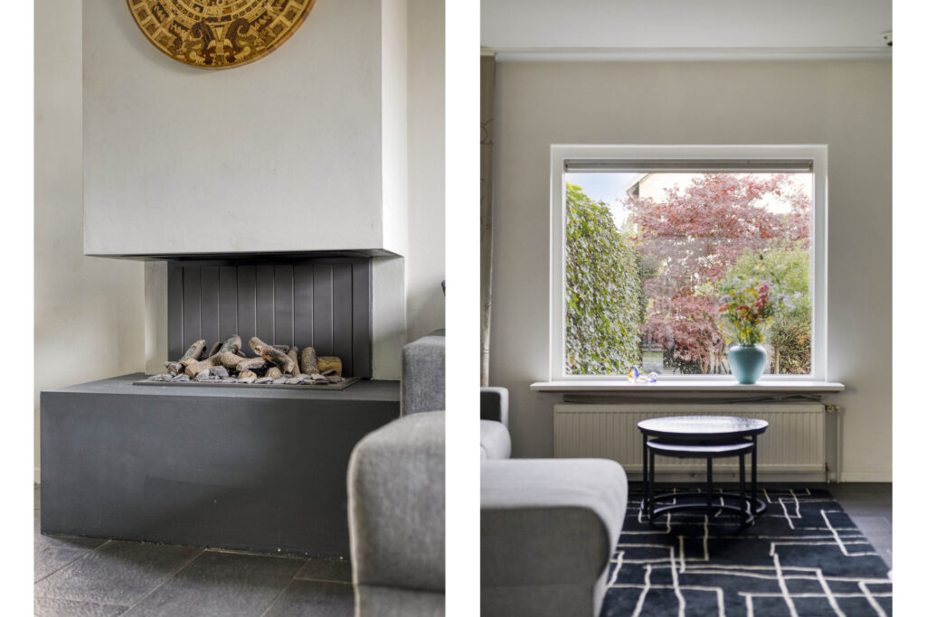 Centraal in de woonkamer bevindt zich een strakke gashaard, die niet alleen sfeer brengt maar ook het middelpunt vormt van het zitgedeelte. Aan de achterzijde is voldoende ruimte voor een royale eettafel; hier zorgen de grote openslaande deuren naar de tuin voor een prettige overgang tussen binnen en buiten.