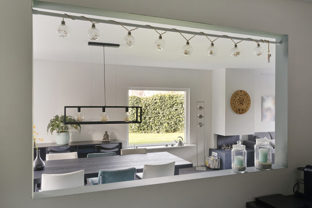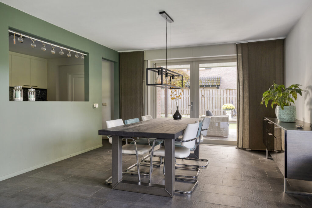 De keuken is gelegen aan de achterzijde van de woning en staat in halfopen verbinding met de woonkamer, waardoor er een prettige interactie ontstaat tussen beide leefruimtes. Via een brede doorkijk is er direct zicht op de eethoek, wat zorgt voor een ruimtelijk en open gevoel.