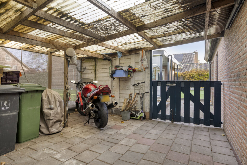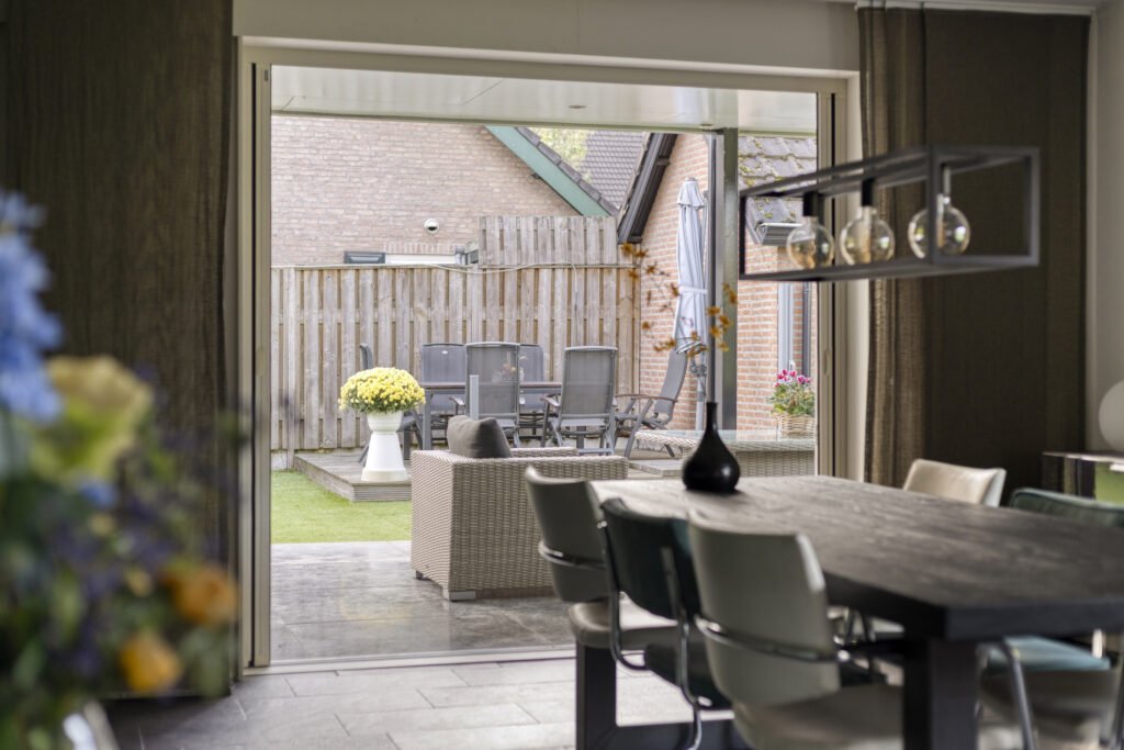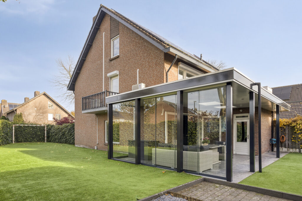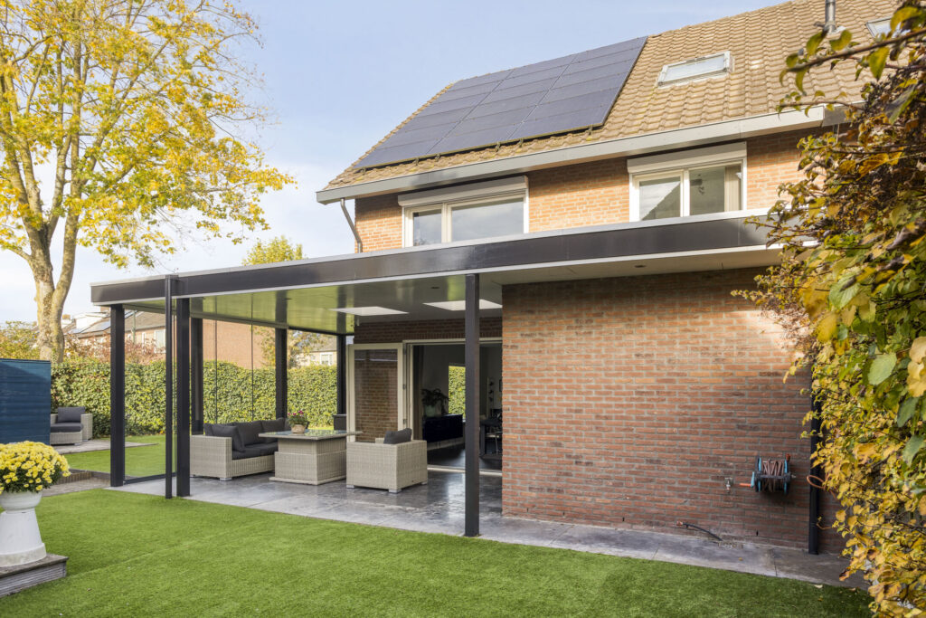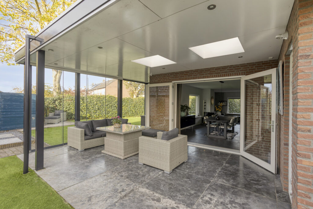 Een echte blikvanger is de moderne overkapping direct aan de woning, deels voorzien van grote glazen (schuif)wanden en twee lichtkoepels. Hierdoor vormt deze overkapping een sfeervolle verlenging van de woonkamer, een groot gedeelte van het jaar is het hier heerlijk vertoeven. Op warme dagen kunnen de glazen wanden worden geopend, terwijl u op koelere avonden geniet van een knusse, overdekte buitenruimte.
