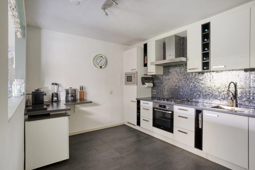 De inrichting bestaat uit een lichte hoekopstelling met hoogglans fronten en een donker werkblad, gecombineerd met een speels mozaïektegelpatroon als achterwand. De keuken is voorzien van diverse inbouwapparatuur, waaronder een gaskookplaat, RVS-afzuigkap, oven, magnetron, vaatwasser (2024), close-in boiler, koelkast en vriezer. Daarnaast is er voldoende werk- en opbergruimte, met praktische kasten tot aan het plafond.