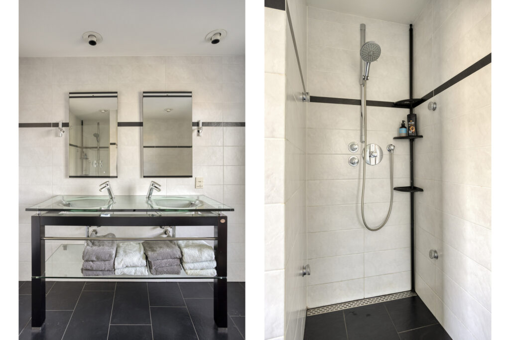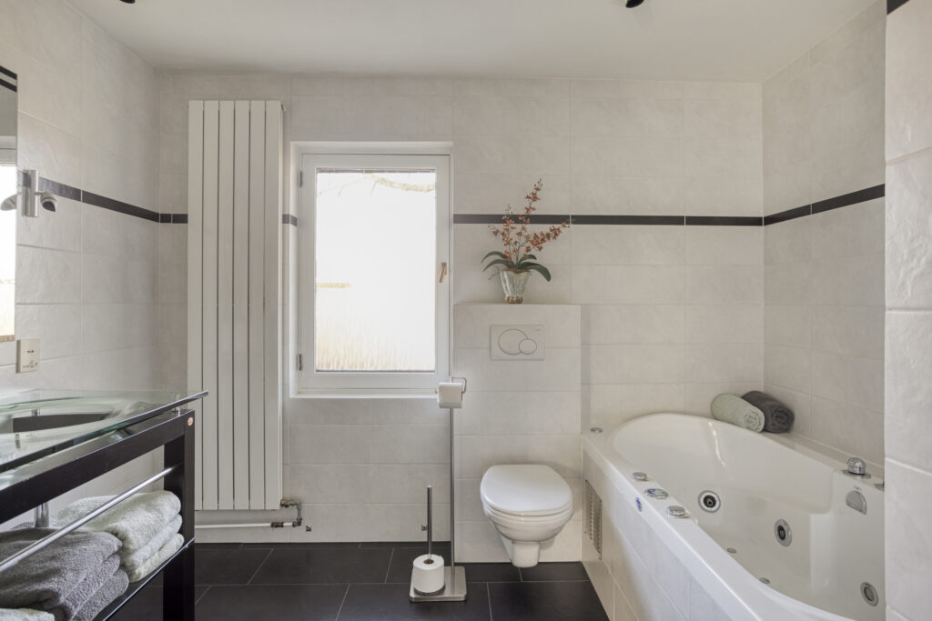 De volledig betegelde badkamer is uitgevoerd in een lichte kleurstelling met een donkere vloer en sierstrip in de wand. De badkamer is luxe uitgerust met een ligbad met whirlpoolfunctie, inloopdouche met (zij)massagestralen, wastafelmeubel met dubbele wastafel en een hangcloset.
