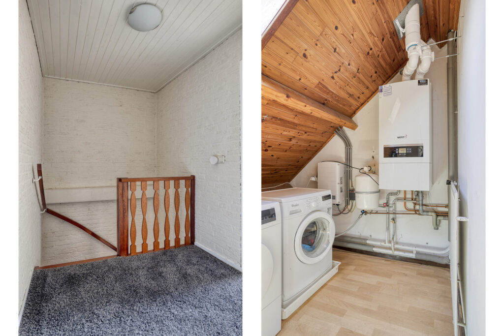 In de separate technische ruimte bevinden zich de CV-installatie (Nefit, 2016), de omvormer van de zonnepanelen en de aansluitingen voor wasmachine en droger. De ruimte is praktisch ingericht met voldoende plaats voor apparatuur en bergruimte, en is afgewerkt met een lichte linoleum vloer en houten dakbeschot.