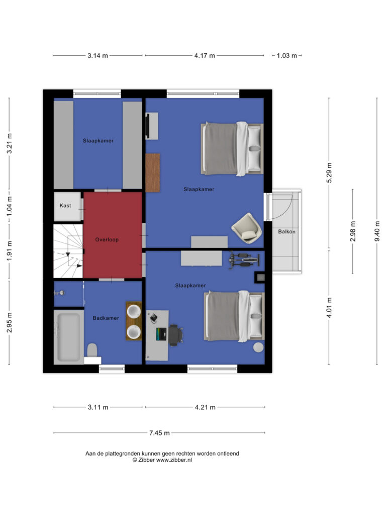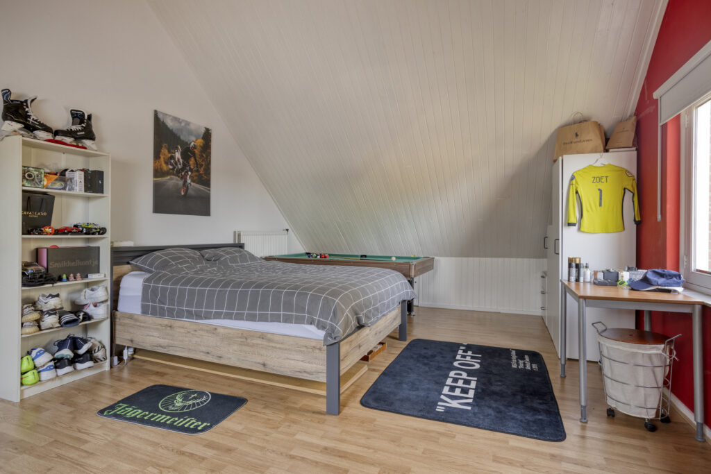 De kamer is voorzien van een lichte laminaatvloer, witte dakafwerking met houten delen en biedt voldoende plaats voor een tweepersoonsbed, bureau en kastruimte. Een ideale kamer voor een tiener of als multifunctionele werk-/hobbyruimte.
