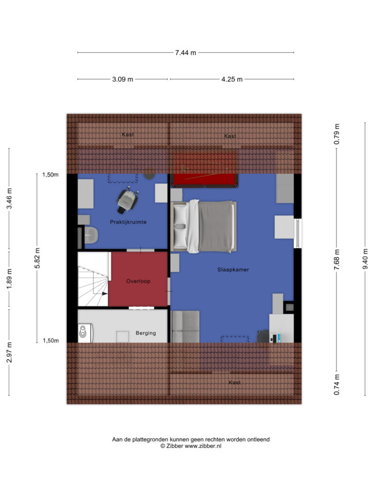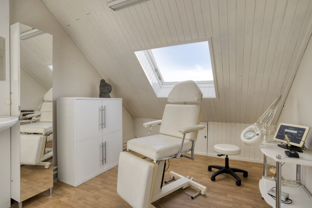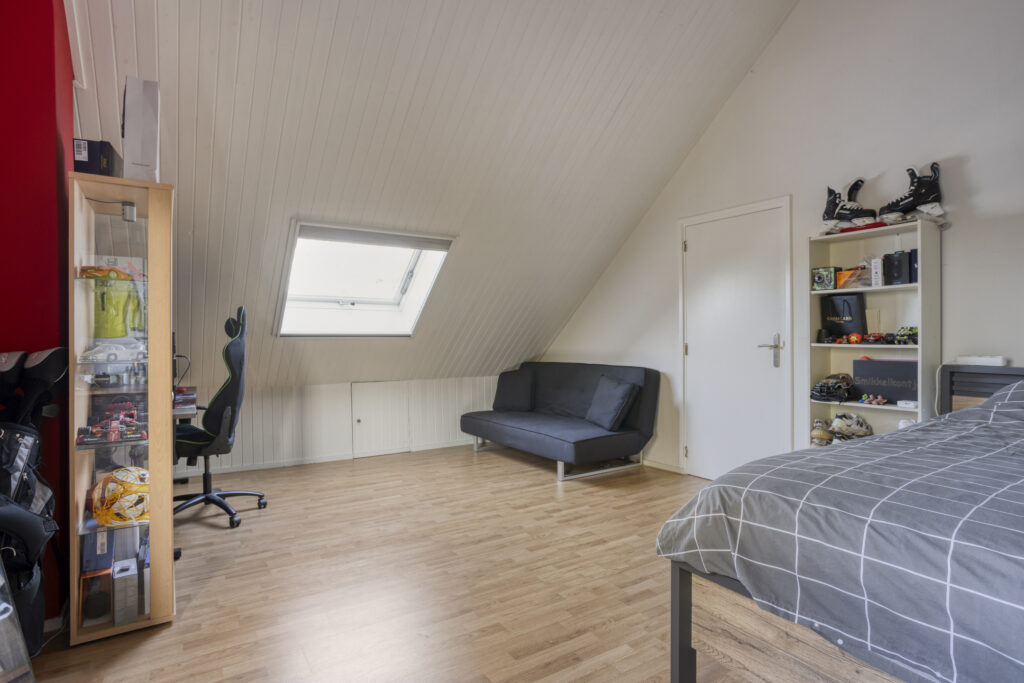 De zolderverdieping herbergt een verrassend ruime vierde slaapkamer, momenteel in gebruik als praktijkruimte, maar ook uitstekend geschikt als logeerkamer, werkkamer of hobbyruimte. In de kamer bevindt zich een kleine vliering met opbergruimte. Dankzij het dakraam valt er volop daglicht binnen, waardoor de kamer licht en aangenaam aanvoelt.