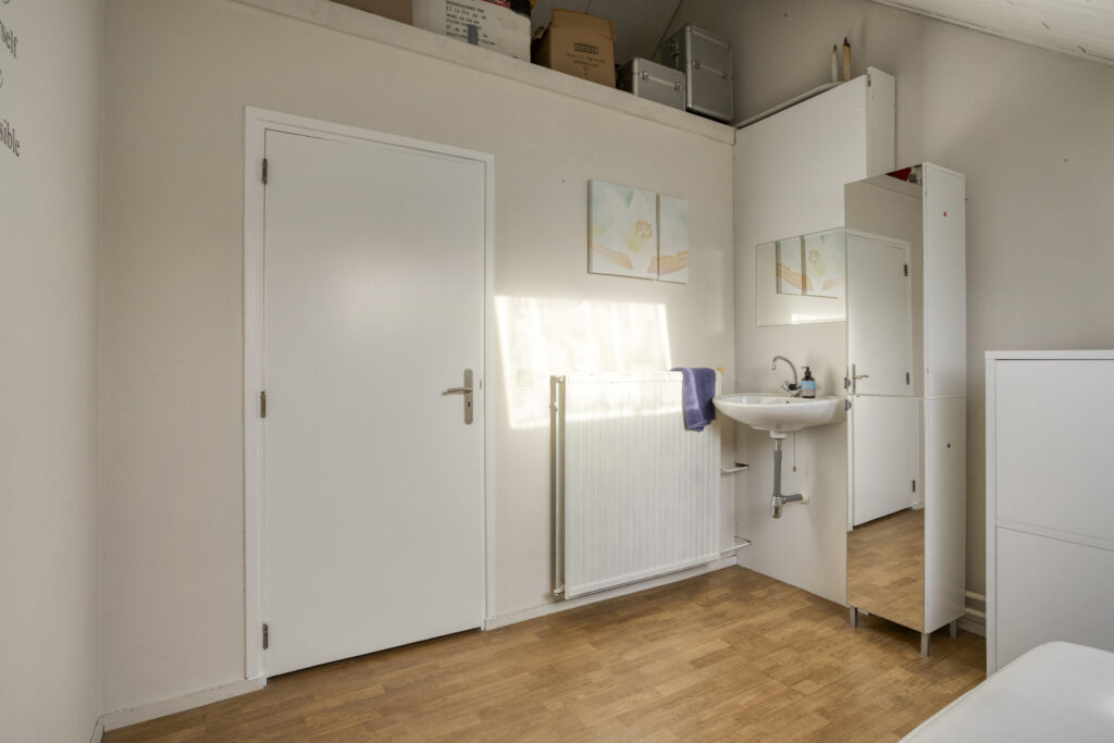 De ruimte is afgewerkt met een lichte laminaatvloer, geschilderde wanden en een wit houten dakafwerking. Verder is er een wastafel aanwezig en zijn er praktische bergruimtes achter de knieschotten, ideaal voor het opbergen van spullen die u niet dagelijks nodig heeft.
