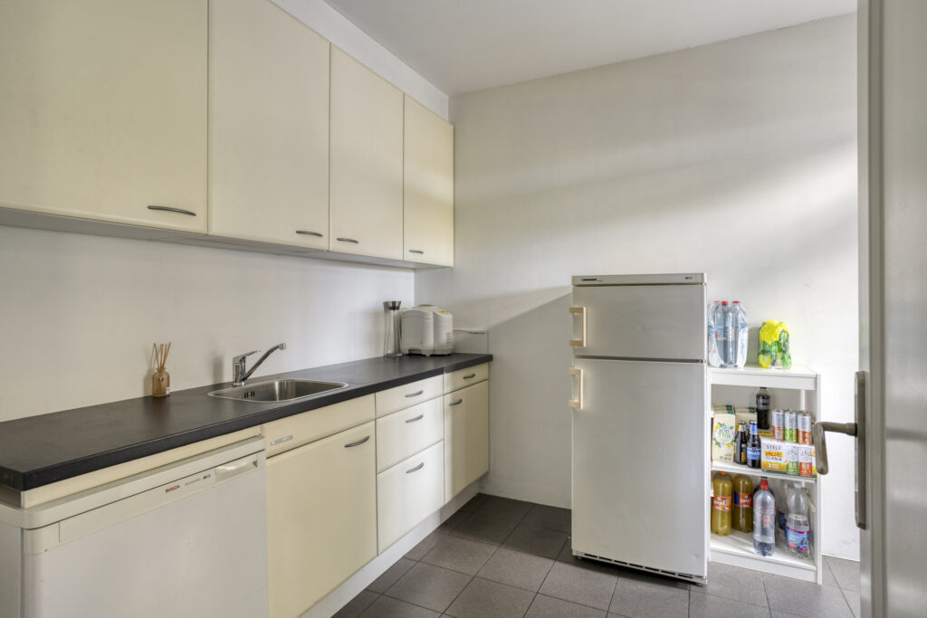 De bijkeuken is afgewerkt met een donkere tegelvloer en lichte wanden, wat zorgt voor een frisse en functionele uitstraling.