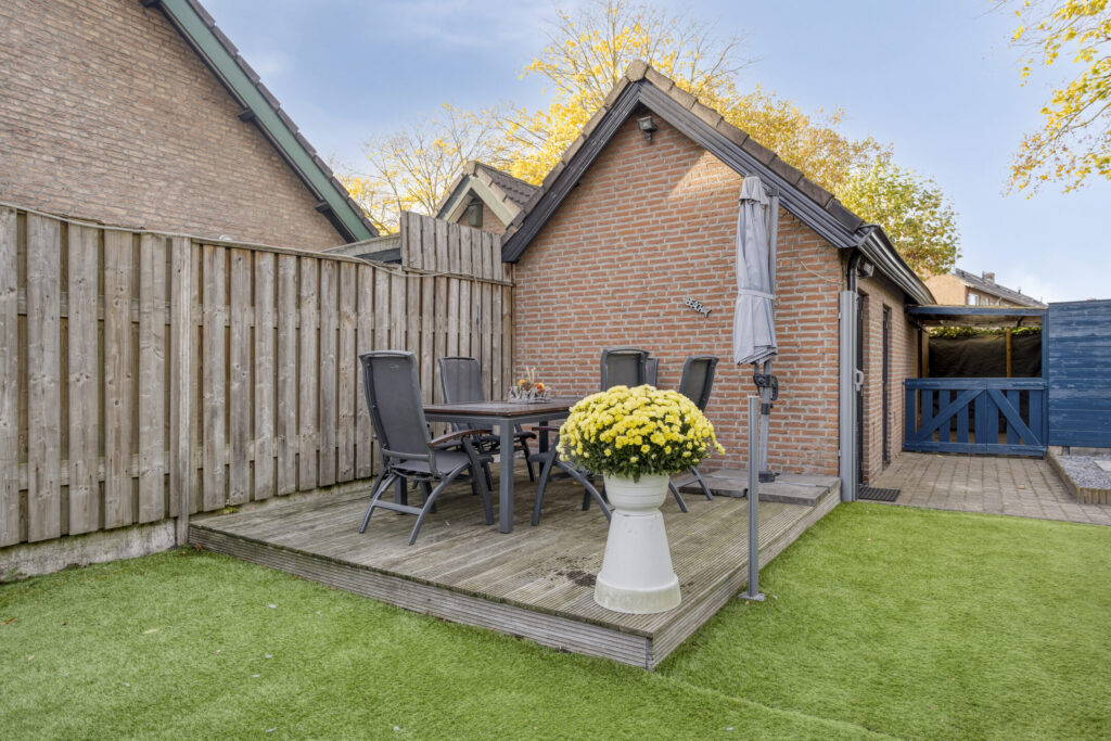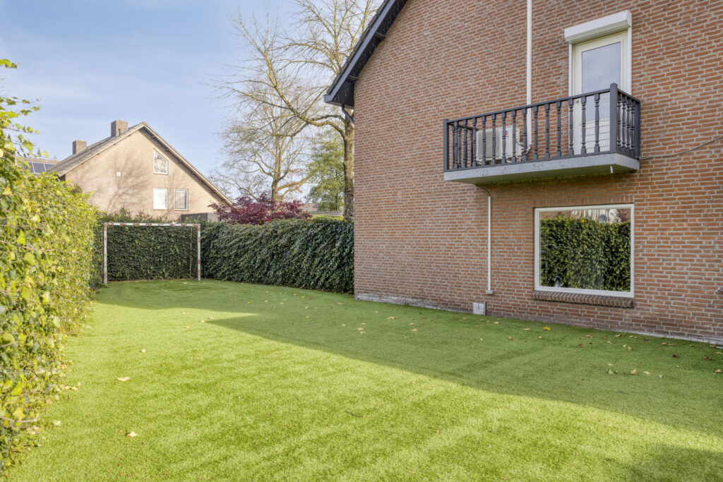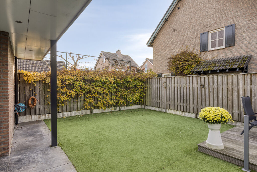 De achtertuin heeft een zuidwestelijke ligging. Doordat de tuin niet alleen achter, maar ook naast de woning ligt kunt u de hele dag kunt genieten van de zon. De tuin is onderhoudsvriendelijk aangelegd met voornamelijk kunstgras en sierbestrating. De tuin is volledig omheind en de erfafscheiding bestaat uit houten schuttingdelen en klimop. Door de hoekligging is er volop privacy. Het perceel is maar liefst 484m² groot, dus er is volop ruimte voor kinderen om te spelen of om meerdere zitplekken te creëren.