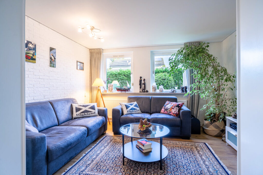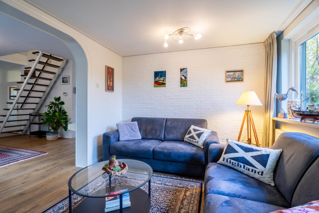 De woonkamer is afgewerkt met een laminaatvloer en geeft middels de openslaande tuindeur toegang tot de achtertuin. De zitkamer, afgewerkt met laminaatvloer en Plameco spanplafond, kan met een kleine aanpassing worden ingericht als kantoor of slaapkamer. In de woonkamer bevindt zich de trap naar de eerste verdieping.