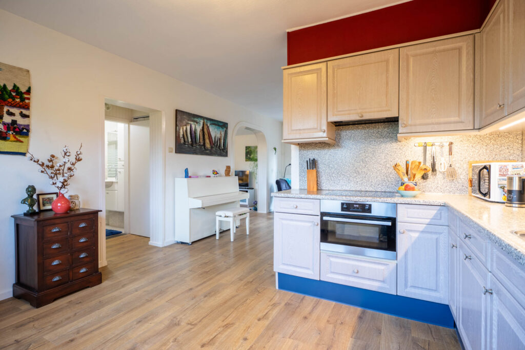 De half open keuken is uitgevoerd in een L-opstelling voorzien van spoelbak, 4-pits keramische kookplaat (Siemens) met afzuigkap, koel,-vries combinatie (Whirlpool), combi-oven (AEG), vaatwasser (Bosch) en onder- en bovenkasten.