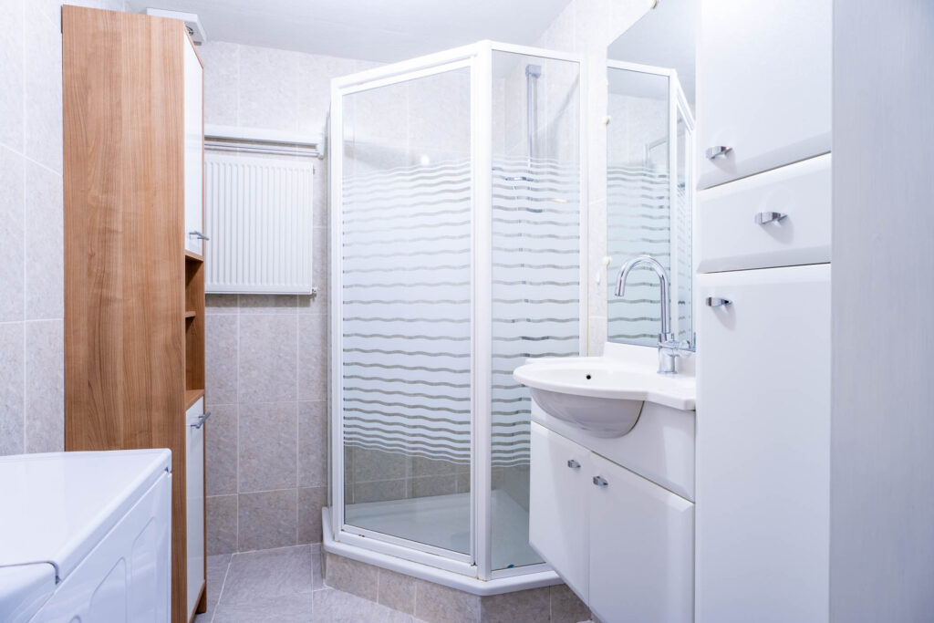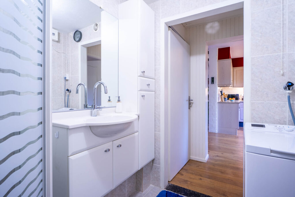 De badkamer op de begane grond, geheel betegeld, is voorzien van douche, wastafel met wastafelmeubel en de wasmachine-aansluiting.