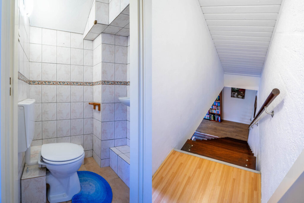 Hal/entree met meterkast (5 standaard groepen en 1 kookgroep, 2 aardlekschakelaars), toilet en toegang tot de woonkamer. Het toilet is afgewerkt met tegelwerk en voorzien van hangend toilet met fonteintje.