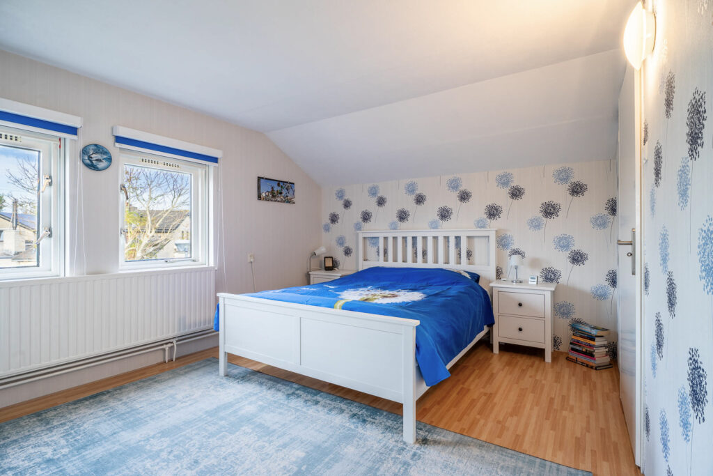 Slaapkamer 2 is afgewerkt met een laminaatvloer, behang en sauswerk en is voorzien van een vaste kastenwand.