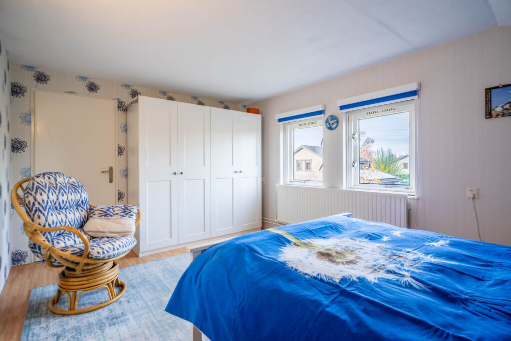 Slaapkamer 1 is afgewerkt met een laminaatvloer, behang en houten balken plafond met systeemplafond, voorzien van vaste kastenwand, wastafel en bergkast met CV-opstelling (Intergas hre bj. 2019).