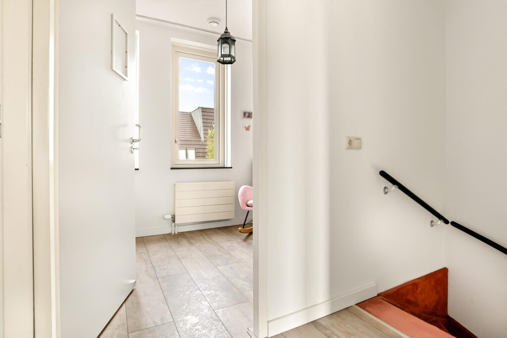 Eerste verdieping: overloop, drie slaapkamers, aparte ruimte met opstelling WTW en cv-ketel en een badkamer v.v. toilet, wastafel en douche.