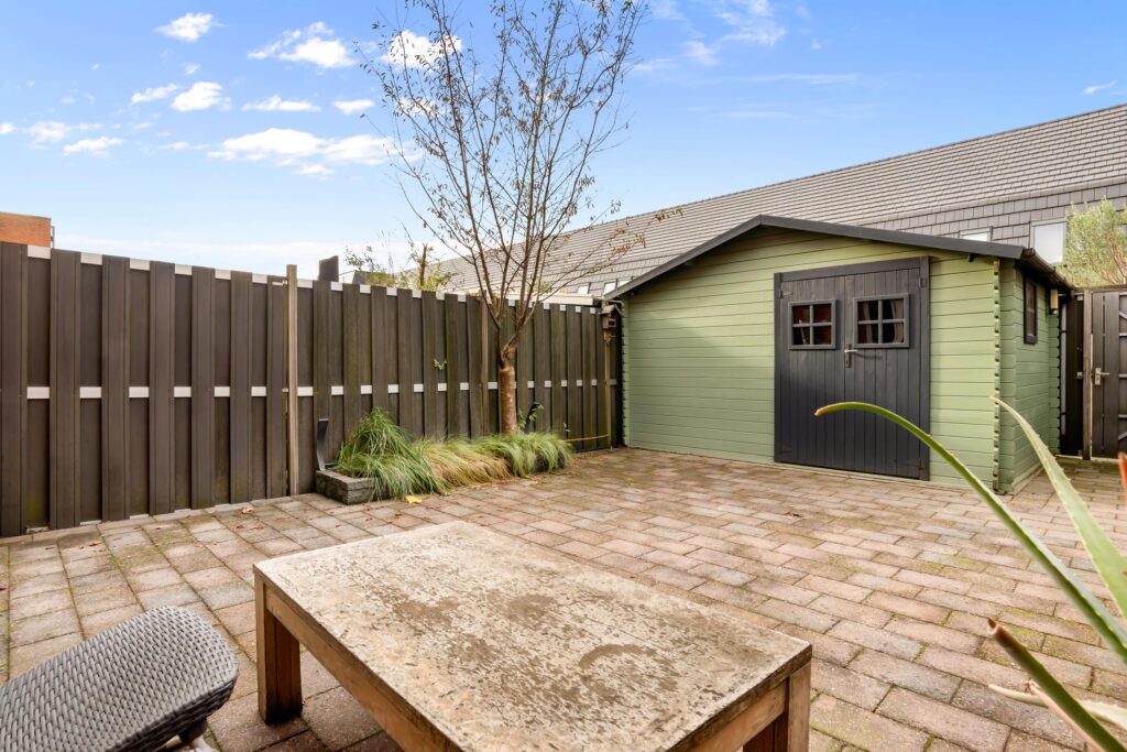 In de achtertuin staat een vrijstaande houten berging v.v. elektra.