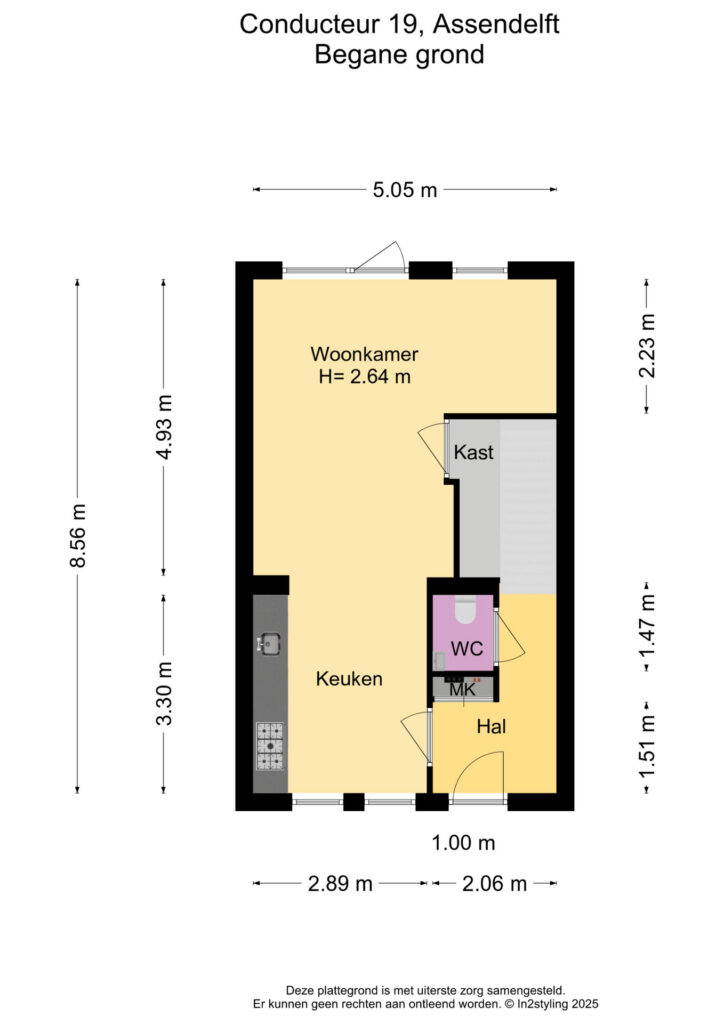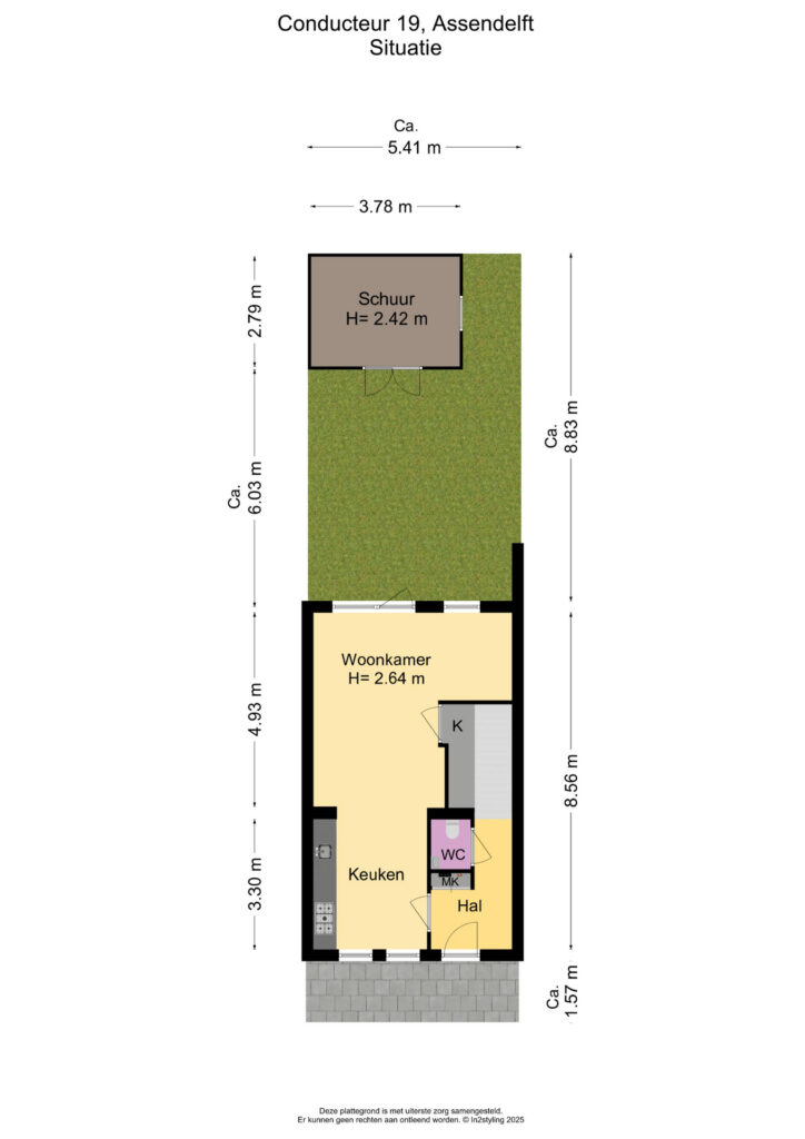 Begane grond: entree, hal, meterkast, toilet met fontein, trapopgang, toegang naar keuken v.v. inbouwapparatuur, tuingerichte woonkamer met trap/provisiekast.