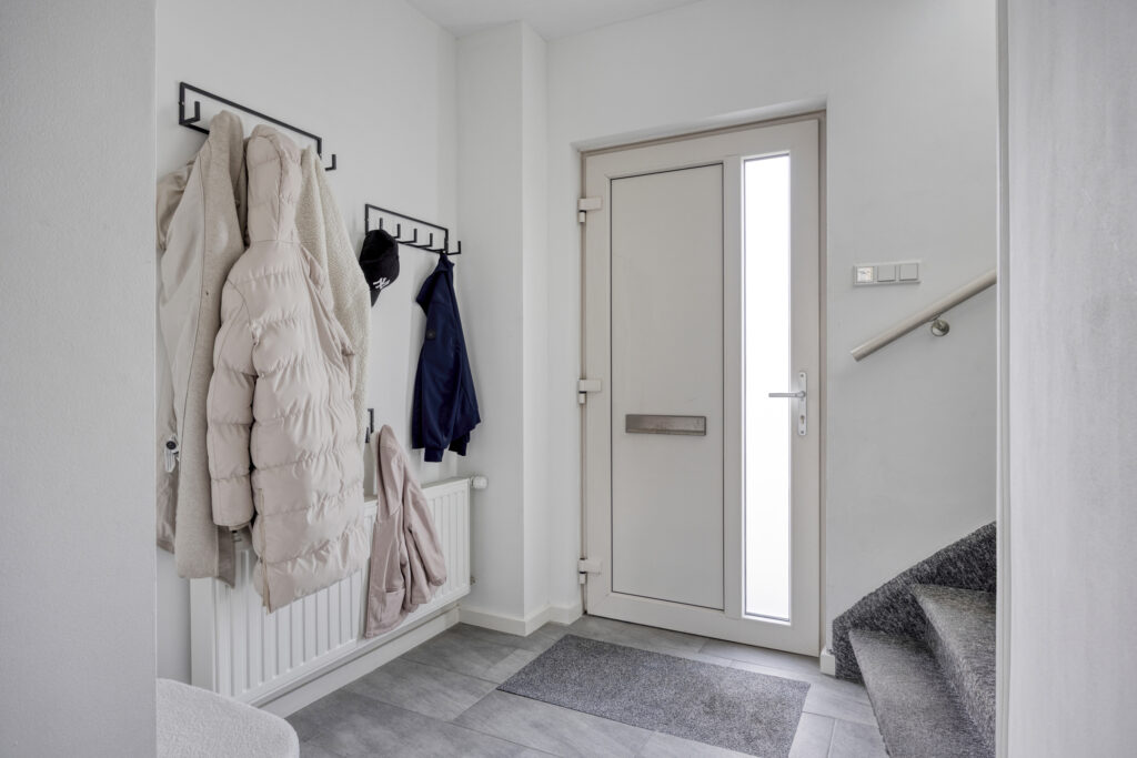 Via de entree met kunststof voordeur en een lichtpunt en buitenkraantje tegen de voorgevel van de woning, betreedt u de hal van deze woning.