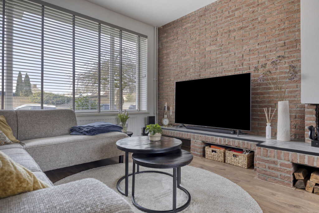 • Nagenoeg alle niet-betegelde wanden en plafonds zijn afgewerkt met glad stucwerk en de woningscheidende wand in de woonkamer met schoonmetselwerk.