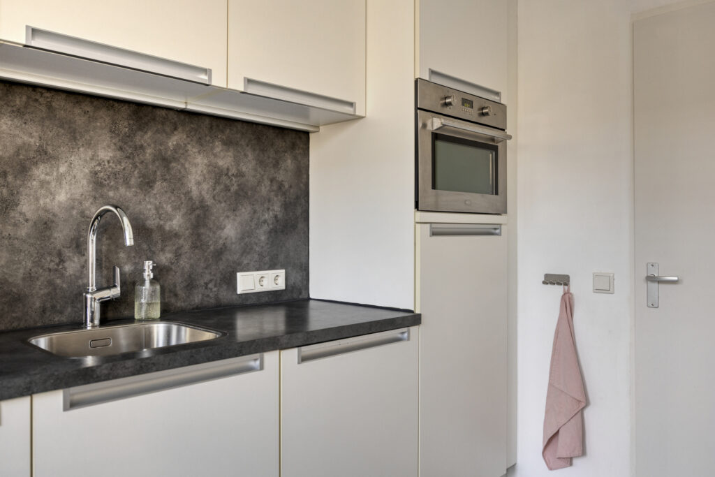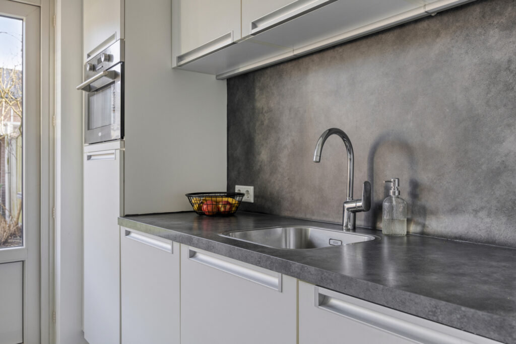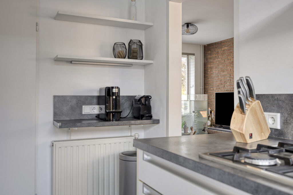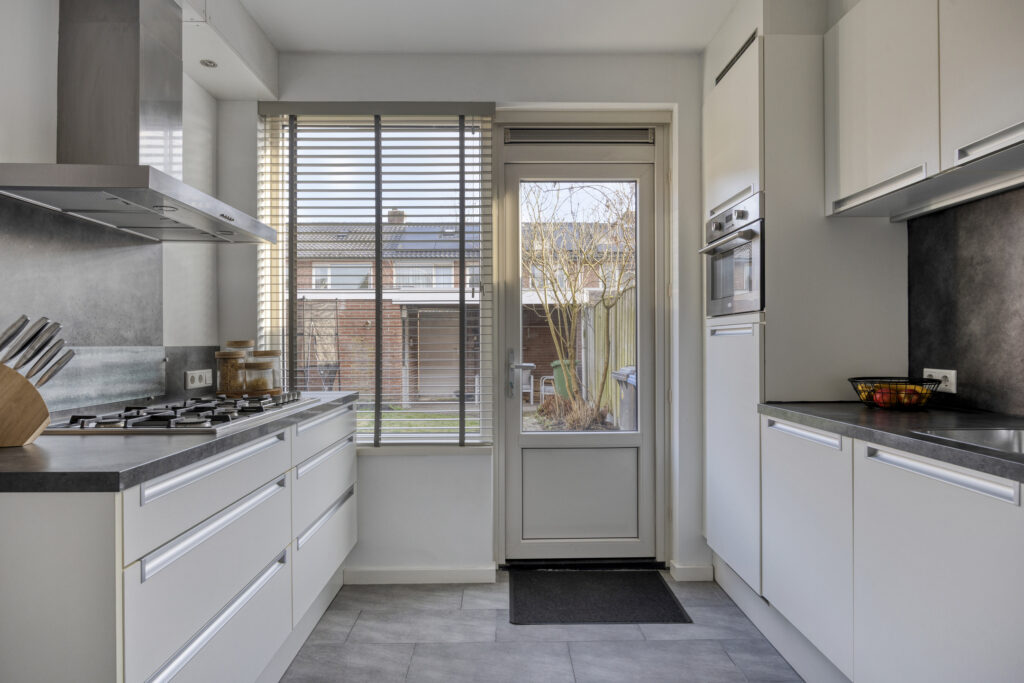 De ruime keuken bevindt zich aan de achterzijde van de woning, met een kunststof deur naar de achtertuin. Deze keuken is modern en praktisch ingericht, met enerzijds een recht keukenblok met onder- en bovenkasten met laden, een houten aanrechtblad en achterwand met een RVS spoelbak met éénhendelmengkraan en LED-strips onder de bovenkasten en een ingebouwde vaatwasser, combimagnetron, oven, vriezer en koelkast.