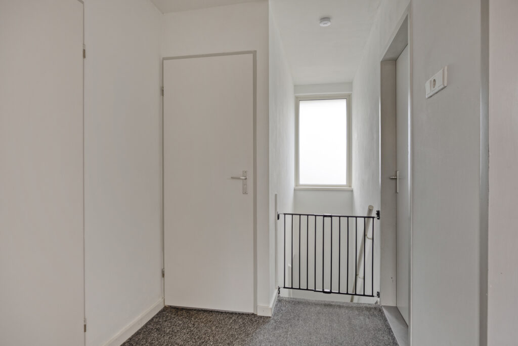 De overloop op deze verdieping, met vloerbedekking en een raam in de voorgevel boven de trapopgang, geeft toegang tot de badkamer, de wasruimte en de 3 drie slaapkamers.