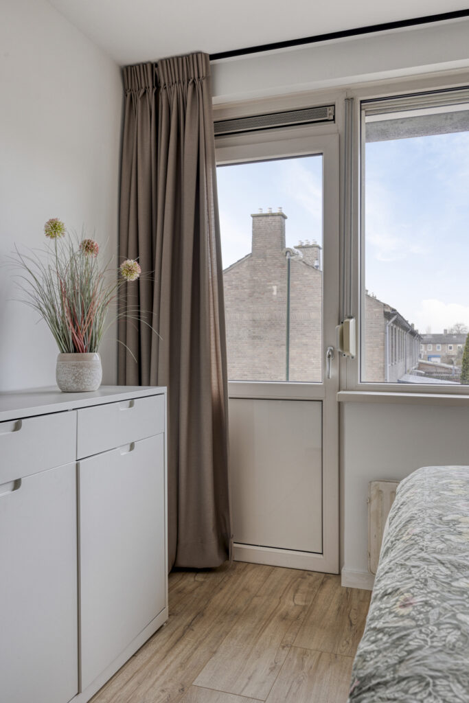 De ouderslaapkamer heeft 2 nissen, waarvan eenvoudig een vaste kastenwand zou kunnen worden gemaakt en een kunststof deur naar het kleine balkon aan de voorzijde.